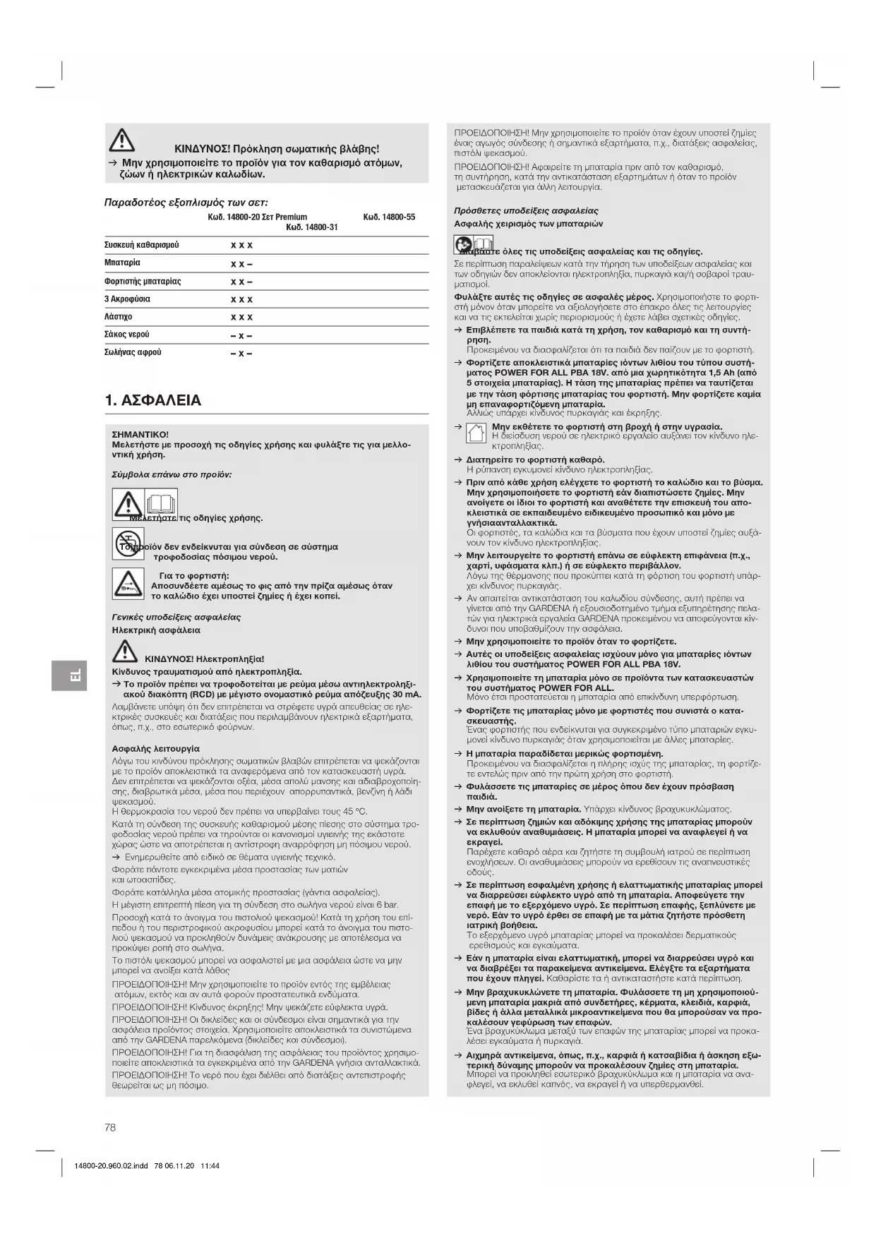 ΚΙΝΔΥΝΟΣ! Πρόκληση σωματικής βλάβης! v Μην χρησιμοποιείτε το προϊόν για τον καθαρισμό ατόμων, ζώων ή ηλεκτρικών καλωδίων. Παραδοτέος εξοπλισμός των σετ: Κωδ. 14800-20 Σετ Premium Κωδ. 14800-31 Κωδ. 14800-55 Συσκευή καθαρισμού x x x