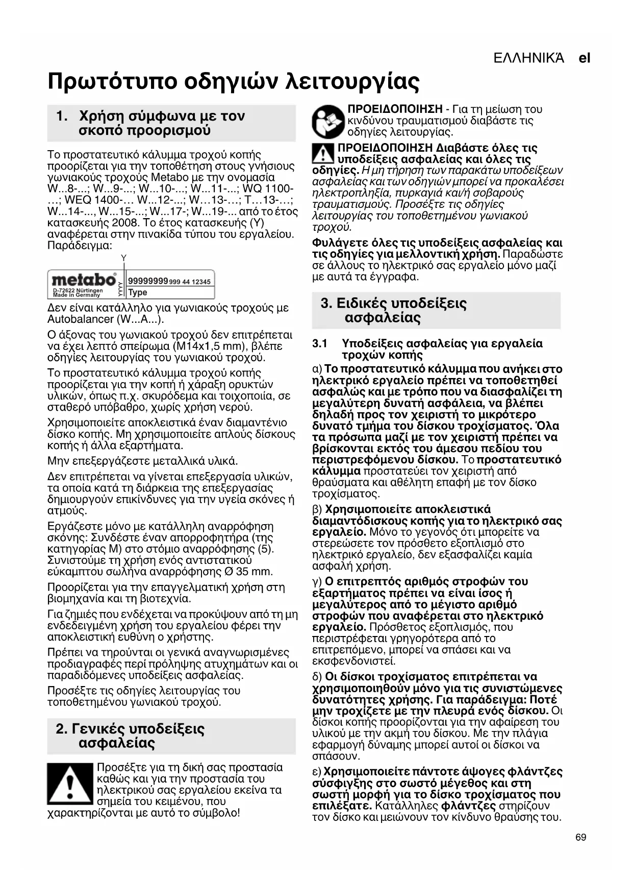 - Πρωτότυπο οδηγιών λειτουργίας Το προστατευτικό κάλυμμα τροχού κοπής προορίζεται για την τοποθέτηση στους γνήσιους γωνιακούς τροχούς Metabo με την ονομασία W - p. 8
