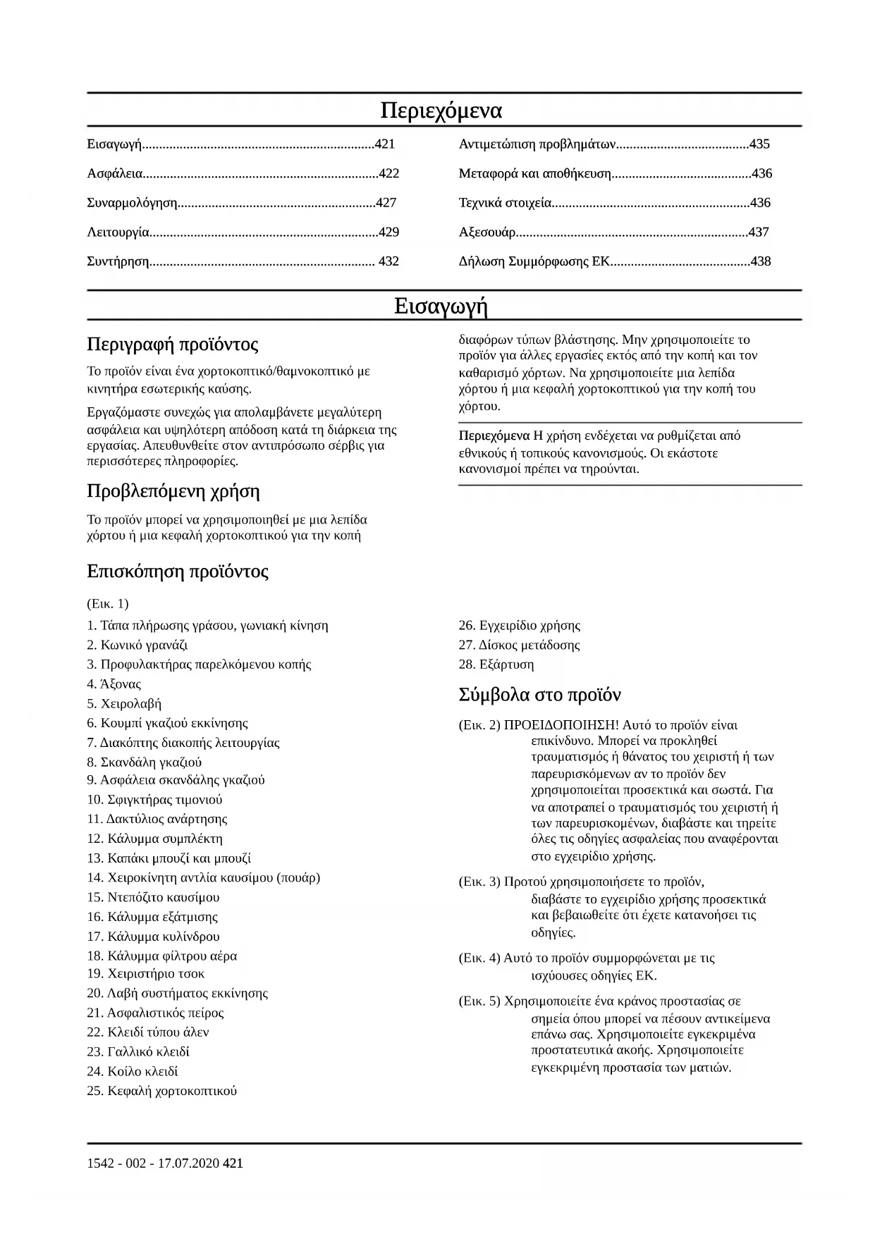 (Εικ. 4) Αυτό το προϊόν συμμορφώνεται με τις ισχύουσες οδηγίες ΕΚ. (Εικ. 5) Χρησιμοποιείτε ένα κράνος προστασίας σε σημεία όπου μπορεί να πέσουν αντικείμενα επάνω σας. Χρησιμοποιείτε εγκεκριμένα προστατευτικά ακοής. Χρησιμοποιείτε εγκεκριμένη προστασία των ματιών. 1542 - 002 - 17.07.2020 421(Εικ. 6) Χρησιμοποιείτε εγκεκριμένα προστατευτικά