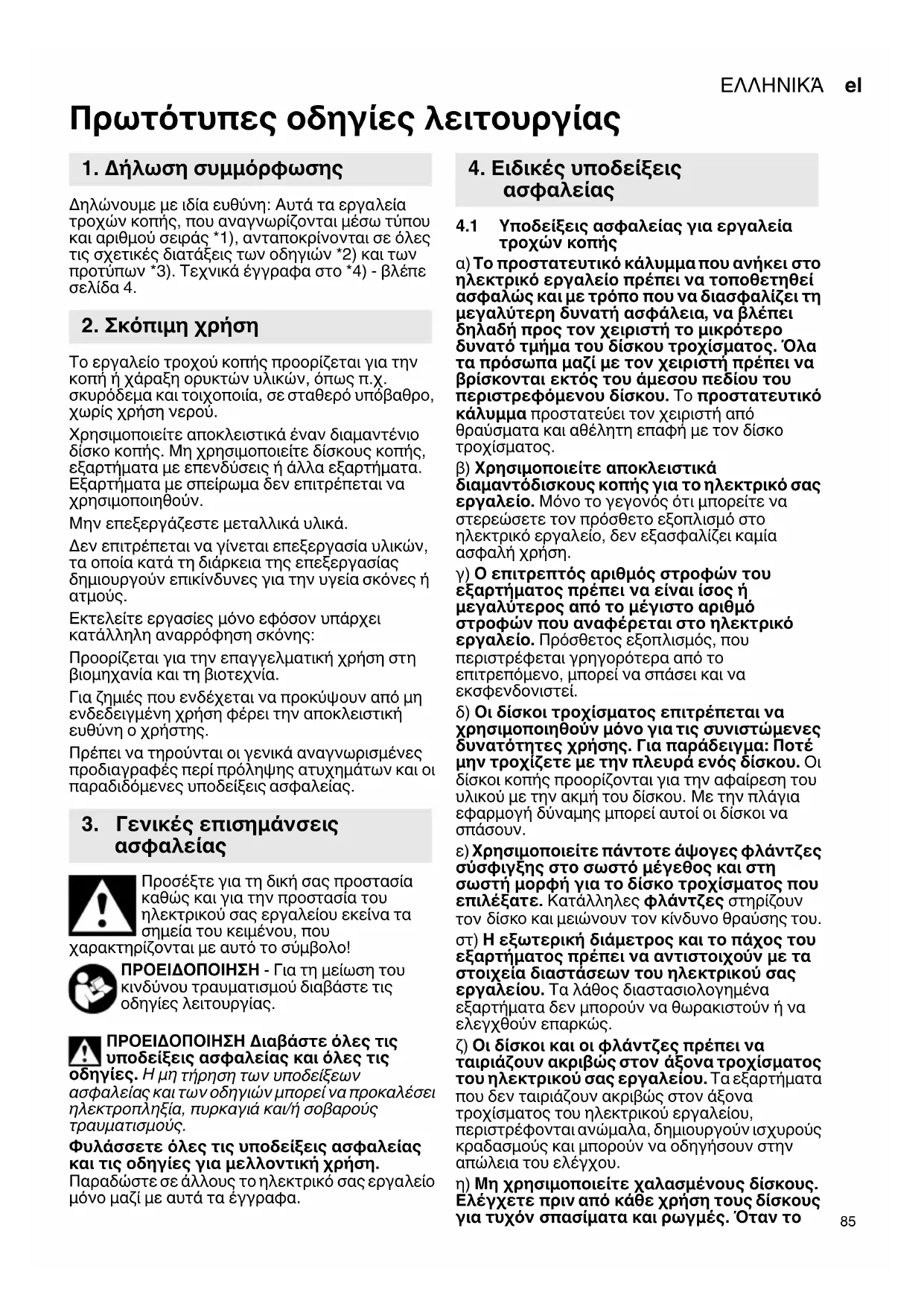 Πρωτότυπες οδηγίες λειτουργίας Δηλώνουμε με ιδία ευθύνη: Αυτά τα εργαλεία τροχών κοπής, που αναγνωρίζονται μέσω τύπου και αριθμού σειράς *1), ανταποκρίνονται σε όλες τις σχετικές διατάξεις των οδηγιών *2) και των προτύπων *3). Τεχνικά έγγραφα στο *4) - βλέπε σελίδα 4. Το εργαλείο τροχού κοπής προορίζεται για την κοπή ή χάραξη ορυκτών υλικών, όπως π.χ. σκυρόδεμα και τοιχοποιία, σε σταθερό υπόβαθρο, χωρίς χρήση νερού. Χρησιμοποιείτε αποκλειστικά έναν διαμαντένιο δίσκο κοπής. Μη χρησιμοποιείτε δίσκους κοπής, εξαρτήματα με επενδύσεις ή άλλα εξαρτήματα. Εξαρτήματα με σπείρωμα δεν επιτρέπεται να χρησιμοποιηθούν. Μην επεξεργάζεστε μεταλλικά υλικά. Δεν επιτρέπεται να γίνεται επεξεργασία υλικών, τα οποία κατά τη διάρκεια της επεξεργασίας δημιουργούν επικίνδυνες για την υγεία