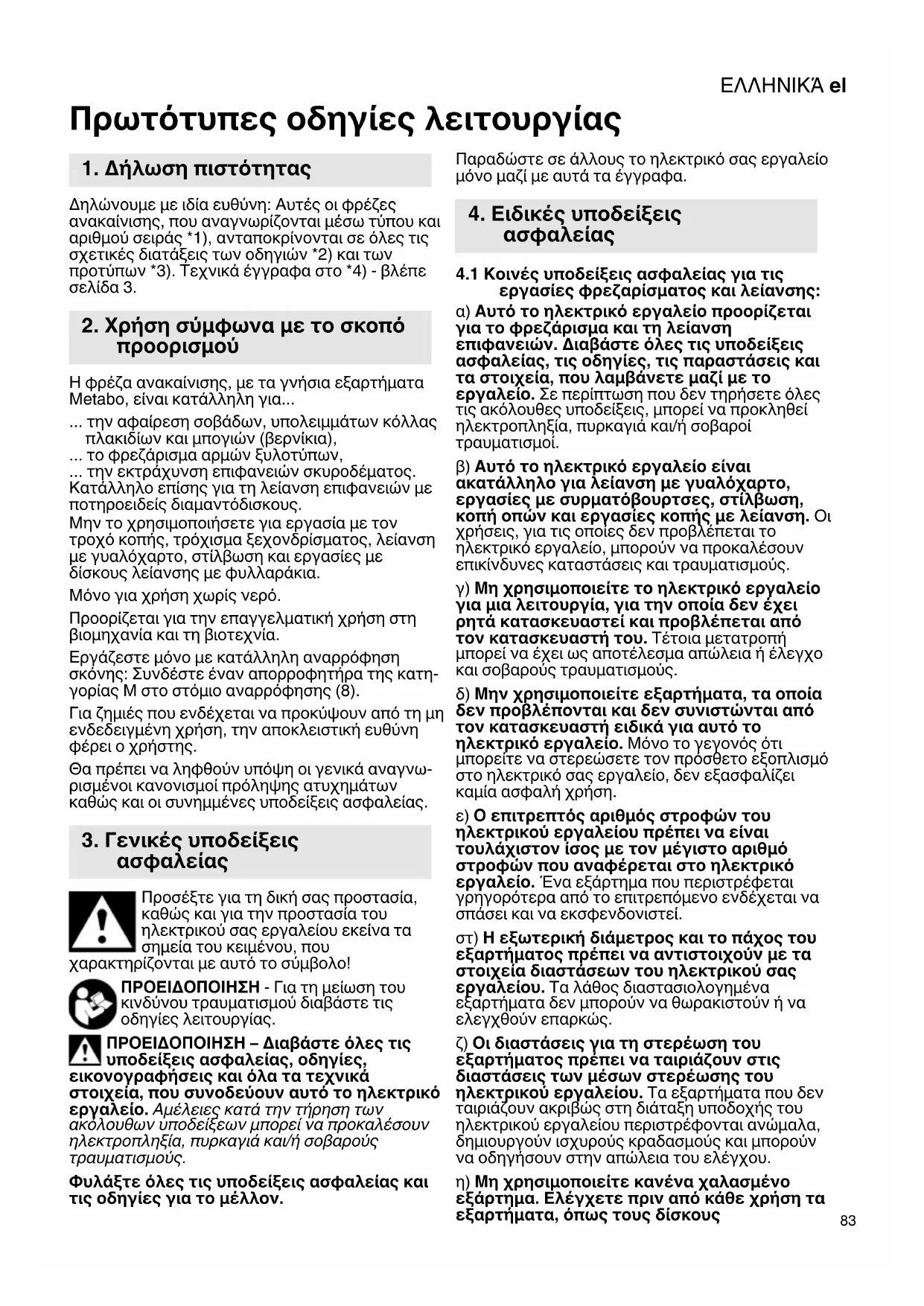 Πρωτότυπες οδηγίες λειτουργίας Δηλώνουμε με ιδία ευθύνη: Αυτές οι φρέζες ανακαίνισης, που αναγνωρίζονται μέσω τύπου και αριθμού σειράς *1), ανταποκρίνονται σε όλες τις σχετικές διατάξεις των οδηγιών *2) και των προτύπων *3). Τεχνικά έγγραφα στο *4) - βλέπε σελίδα 3. Η φρέζα ανακαίνισης, με τα γνήσια εξαρτήματα Metabo, είναι κατάλληλη για... ... την αφαίρεση σοβάδων, υπολειμμάτων κόλλας πλακιδίων και μπογιών (βερνίκια), ... το φρεζάρισμα αρμών ξυλοτύπων, ... την εκτράχυνση επιφανειών σκυροδέματος. Κατάλληλο επίσης για τη λείανση επιφανειών με ποτηροειδείς διαμαντόδισκους. Μην το χρησιμοποιήσετε για εργασία με τον τροχό κοπής, τρόχισμα ξεχονδρίσματος, λείανση με γυαλόχαρτο, στίλβωση και εργασίες με δίσκους λείανσης με φυλλαράκια. Μόνο για χρήση χωρίς νερό. Προορίζεται για την επαγγελματική χρήση στη βιομηχανία και τη βιοτεχνία. Εργάζεστε μόνο με κατάλληλη αναρρόφηση σκόνης: Συνδέστε έναν απορροφητήρα της κατη- γορίας M στο στόμιο αναρρόφησης (8). Για ζημιές που ενδέχεται να προκύψουν από τη μη ενδεδειγμένη χρήση, την αποκλειστική ευθύνη φέρει ο χρήστης. Θα πρέπει να ληφθούν υπόψη οι γενικά αναγνω- ρισμένοι κανονισμοί πρόληψης ατυχημάτων καθώς και οι συνημμένες υποδείξεις ασφαλείας. Προσέξτε για τη δική σας προστασία, καθώς και για την προστασία του ηλεκτρικού σας εργαλείου εκείνα τα σημεία του κειμένου, που χαρακτηρίζονται με αυτό το σύμβολο! ΠΡΟΕΙΔΟΠΟΙΗΣΗ - Για τη μείωση του κινδύνου τραυματισμού διαβάστε τις οδηγίες λειτουργίας. ΠΡΟΕΙΔΟΠΟΙΗΣΗ – Διαβάστε όλες τις υποδείξεις ασφαλείας, οδηγίες, εικονογραφήσεις και όλα τα τεχνικά στοιχεία, που συνοδεύουν αυτό το ηλεκτρικό εργαλείο. Αμέλειες κατά την τήρηση των ακόλουθων υποδείξεων μπορεί να προκαλέσουν ηλεκτροπληξία, πυρκαγιά και/ή σοβαρούς τραυματισμούς. Φυλάξτε όλες τις υποδείξεις ασφαλείας και τις οδηγίες για το μέλλον. Παραδώστε σε άλλους το ηλεκτρικό σας εργαλείο μόνο μαζί με αυτά τα έγγραφα.