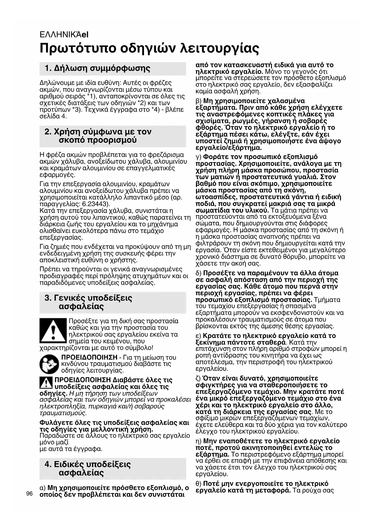 Για την επεξεργασία αλουμινίου, κραμάτων αλουμινίου και ανοξείδωτου χάλυβα πρέπει να χρησιμοποιείται κατάλληλο λιπαντικό μέσο (αρ. παραγγελίας: 6.23443). Κατά την επεξεργασία χάλυβα, συνιστάται η χρήση αυτού του λιπαντικού, καθώς παρατείνει τη διάρκεια ζωής του εργαλείου και το μηχάνημα ολισθαίνει ευκολότερα πάνω στο τεμάχιο επεξεργασίας. Για ζημιές που ενδέχεται να προκύψουν από τη μη ενδεδειγμένη χρήση της συσκευής φέρει την αποκλειστική ευθύνη ο χρήστης. Πρέπει να τηρούνται οι γενικά αναγνωρισμένες προδιαγραφές περί πρόληψης ατυχημάτων και οι παραδιδόμενες υποδείξεις ασφαλείας. Προσέξτε για τη δική σας προστασία καθώς και για την προστασία του ηλεκτρικού σας εργαλείου εκείνα τα σημεία του κειμένου, που χαρακτηρίζονται με αυτό το σύμβολο! ΠΡΟΕΙΔΟΠΟΙΗΣΗ - Για τη μείωση του κινδύνου τραυματισμού διαβάστε τις οδηγίες λειτουργίας. ΠΡΟΕΙΔΟΠΟΙΗΣΗ Διαβάστε όλες τις υποδείξεις ασφαλείας και όλες τις οδηγίες. Η μη τήρηση των υποδείξεων ασφαλείας και των οδηγιών μπορεί να προκαλέσει ηλεκτροπληξία, πυρκαγιά και/ή σοβαρούς τραυματισμούς. Φυλάγετε όλες τις υποδείξεις ασφαλείας και τις οδηγίες για μελλοντική χρήση. Παραδώστε σε άλλους το ηλεκτρικό σας εργαλείο