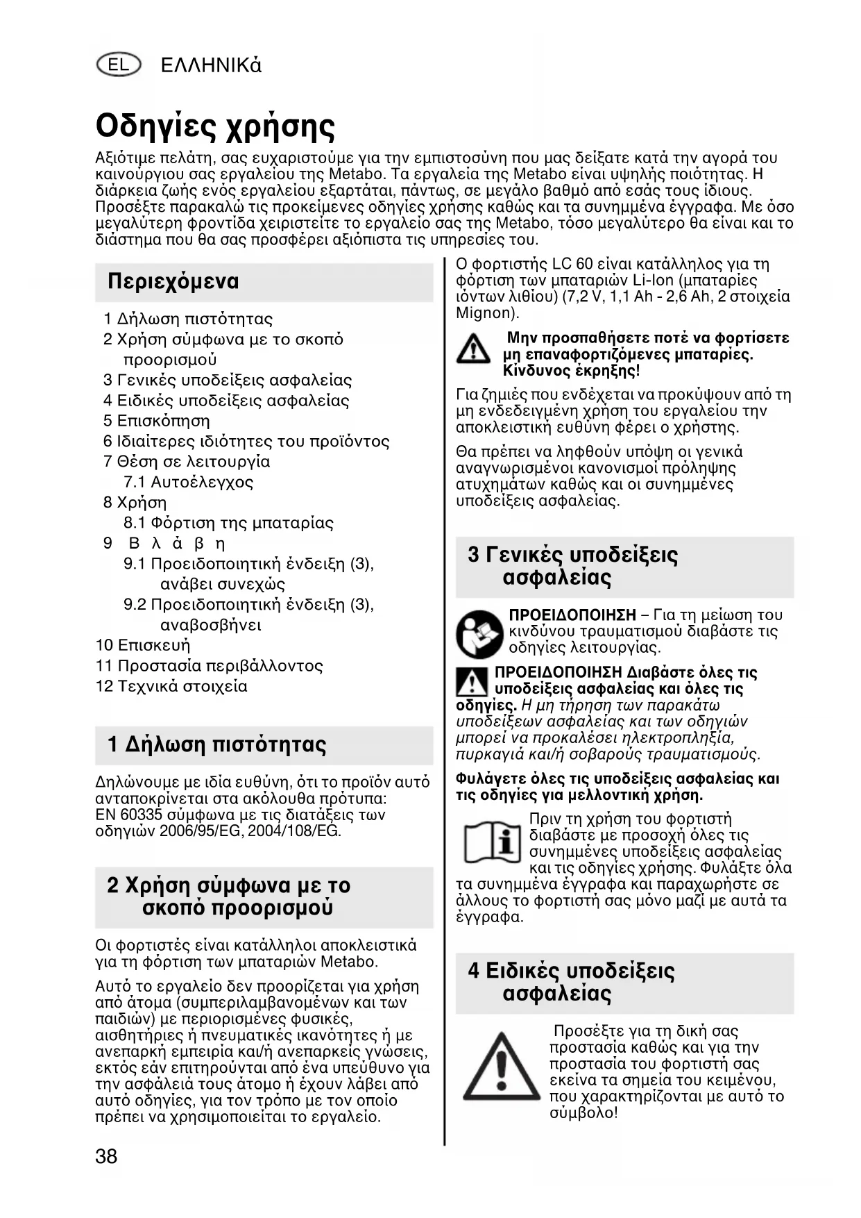 Οι φορτιστές είναι κατάλληλοι αποκλειστικά για τη φρτιση των μπαταριών Metabo. Αυτ το εργαλείο δεν προορίζεται για χρήση απ άτομα (συμπεριλαμβανομένων και των παιδιών) με περιορισμένες φυσικές, αισθητήριες ή πνευματικές ικαντητες ή με ανεπαρκή εμπειρία και/ή ανεπαρκείς γνώσεις, εκτς εάν επιτηρούνται απ ένα υπεύθυνο για την ασφάλειά τους άτομο ή έχουν λάβει απ αυτ οδηγίες, για τον τρπο με τον οποίο πρέπει να χρησιμοποιείται το εργαλείο. Ο φορτιστής LC 60 είναι κατάλληλος για τη φρτιση των μπαταριών Li-Ion (μπαταρίες ιντων λιθίου) (7,2 V, 1,1 Ah - 2,6 Ah, 2 στοιχεία Mignon). Μην προσπαθήσετε ποτέ να φορτίσετε μη επαναφορτιζμενες μπαταρίες. Κίνδυνος έκρηξης! Για ζημιές που ενδέχεται να προκύψουν απ τη μη ενδεδειγμένη χρήση του εργαλείου την αποκλειστική ευθύνη φέρει ο χρήστης. Θα πρέπει να ληφθούν υπψη οι γενικά αναγνωρισμένοι κανονισμοί πρληψης ατυχημάτων καθώς και οι συνημμένες υποδείξεις ασφαλείας. ΠΡΟΕΙΔΟΠΟΙΗΣΗ – Για τη μείωση του κινδύνου τραυματισμού διαβάστε τις οδηγίες λειτουργίας. ΠΡΟΕΙΔΟΠΟΙΗΣΗ Διαβάστε λες τις υποδείξεις ασφαλείας και λες τις