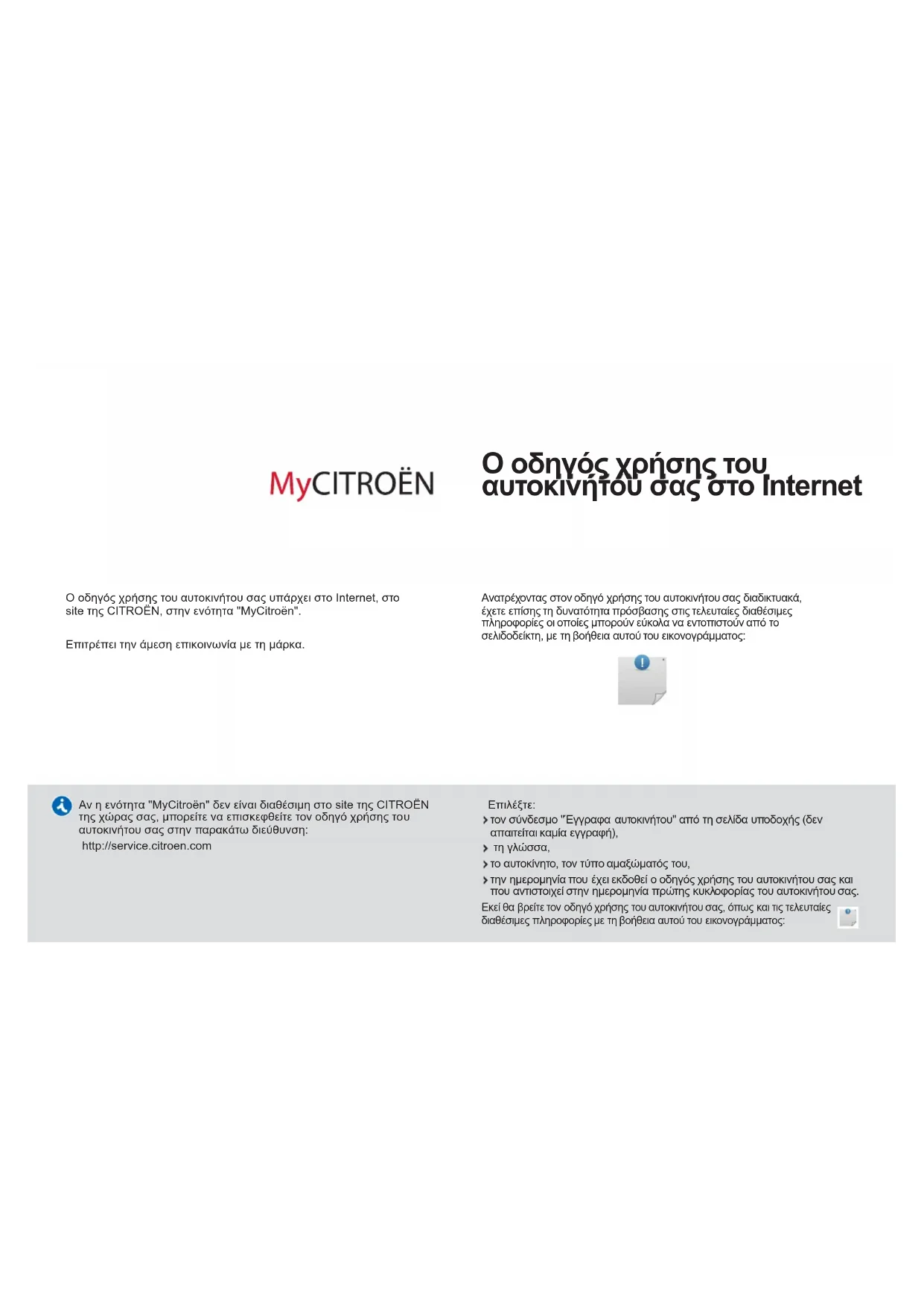 Ανατρέχοντας στον οδηγό χρήσης του αυτοκινήτου σας διαδικτυακά, έχετε επίσης τη δυνατότητα πρόσβασης στις τελευταίες διαθέσιμες πληροφορίες οι οποίες μπορούν εύκολα να εντοπιστούν από το σελιδοδείκτη, με τη βοήθεια αυτού του εικονογράμματος: Αν η ενότητα "MyCitroën" δεν είναι διαθέσιμη στο site της CITROËN της χώρας σας, μπορείτε να επισκεφθείτε τον οδηγό χρήσης του αυτοκινήτου σας στην παρακάτω διεύθυνση: http://service.citroen.com