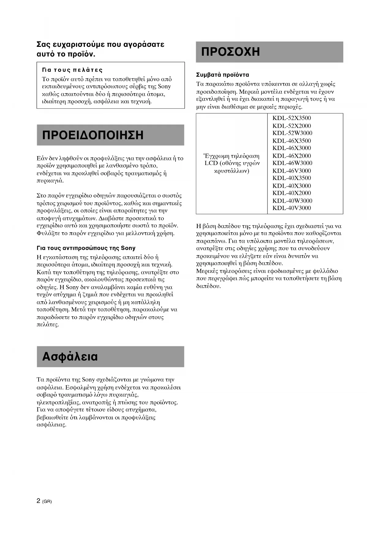 Έγχρωμη τηλεραση LCD (οθνης υγρών κρυστάλλων) KDL-52X3500 KDL-52X2000 KDL-52W3000 KDL-46X3500 KDL-46X3000 KDL-46X2000 KDL-46W3000 KDL-46V3000 KDL-40X3500 KDL-40X3000 KDL-40X2000 KDL-40W3000 KDL-40V30003 (GR) Τα προϊντα πρέπει να τοποθετούνται μνο απ εκπαιδευμένους αντιπροσώπους σέρβις της Sony. Το βάρος της τηλερασης και της βάσης δαπέδου είναι πολύ μεγάλο. Τυχν τοποθέτηση απ μη εκπαιδευμένο προσωπικ, ενδέχεται να οδηγήσει σε σοβαρ τραυματισμ. Βεβαιωθείτε τι έχετε λάβει τα απαραίτητα μέτρα ώστε να αποτραπεί η πτώση της βάσης