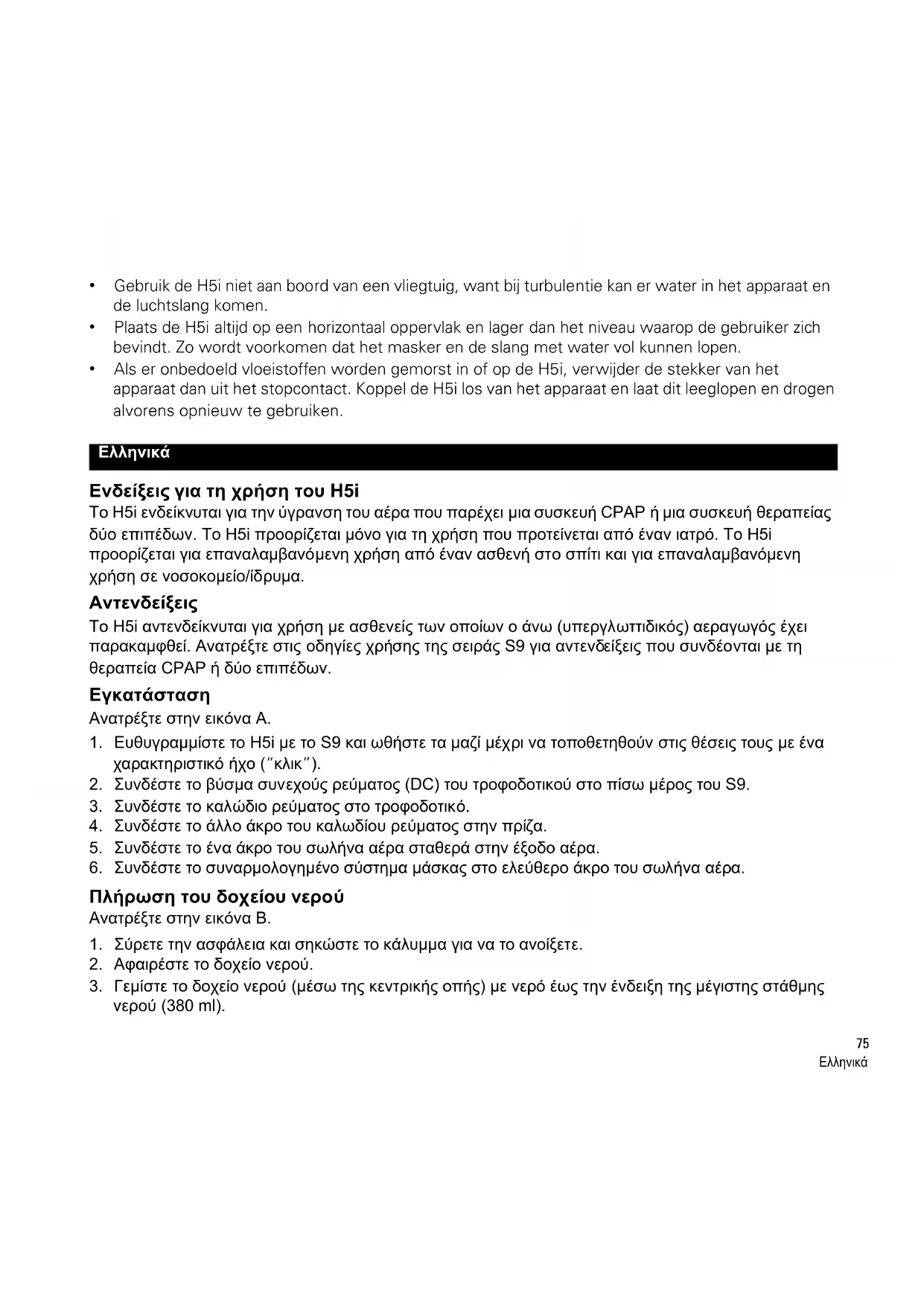 - Als er onbedoeld vloeistoffen worden gemorst in of op de H5i, verwijder de stekker van het apparaat dan uit het stopcontact. Koppel de H5i los van het apparaat en laat dit leeglopen en drogen alvorens opnieuw te gebruiken. Ενδείξεις για τη χρήση του H5i Το H5i ενδείκνυται για την ύγρανση του αέρα που παρέχει μια συσκευή CPAP ή μια συσκευή θεραπείας δύο επιπέδων. Το H5i προορίζεται μόνο για τη χρήση που προτείνεται από έναν ιατρό. Το H5i προορίζεται για επαναλαμβανόμενη χρήση από έναν ασθενή στο σπίτι και για επαναλαμβανόμενη χρήση σε νοσοκομείο/ίδρυμα. Αντενδείξεις Το H5i αντενδείκνυται για χρήση με ασθενείς των οποίων ο άνω (υπεργλωττιδικός) αεραγωγός έχει παρακαμφθεί. Ανατρέξτε στις οδηγίες χρήσης της σειράς S9 για αντενδείξεις που συνδέονται με τη θεραπεία CPAP ή δύο επιπέδων. Εγκατάσταση Ανατρέξτε στην εικόνα A.