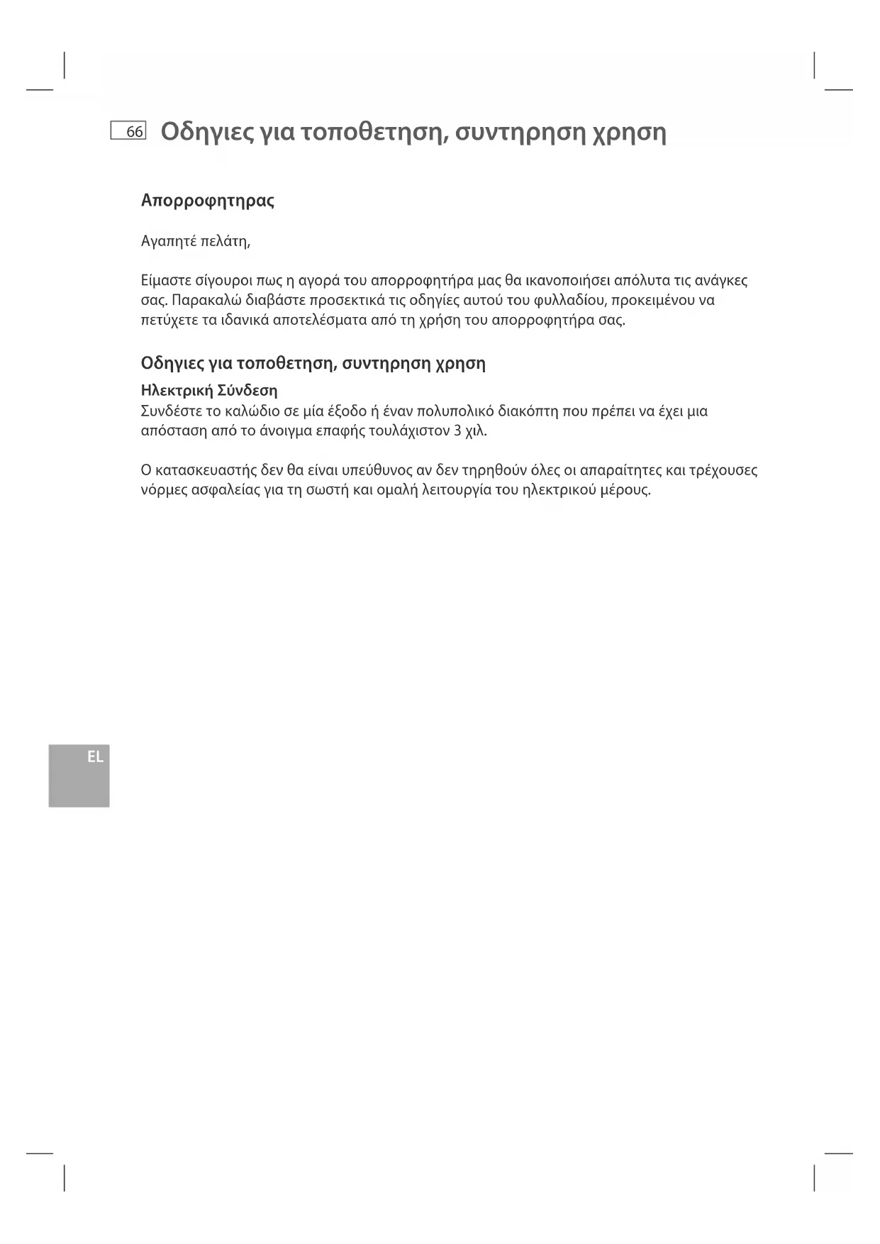 Οδηγιες για τοποθετηση, συντηρηση χρηση Απορροφητηρας Αγαπητέ πελάτη, Είμαστε σίγουροι πως η αγορά του απορροφητήρα μας θα ικανοποιήσει απόλυτα τις ανάγκες σας. Παρακαλώ διαβάστε προσεκτικά τις οδηγίες αυτού του φυλλαδίου, προκειμένου να πετύχετε τα ιδανικά αποτελέσματα από τη χρήση του απορροφητήρα σας. Οδηγιες για τοποθετηση, συντηρηση χρηση Ηλεκτρική Σύνδεση Συνδέστε το καλώδιο σε μία έξοδο ή έναν πολυπολικό διακόπτη που πρέπει να έχει μια απόσταση από το άνοιγμα επαφής τουλάχιστον 3 χιλ. Ο κατασκευαστής δεν θα είναι υπεύθυνος αν δεν τηρηθούν όλες οι απαραίτητες και τρέχουσες νόρμες ασφαλείας για τη σωστή και ομαλή λειτουργία του ηλεκτρικού μέρους.67