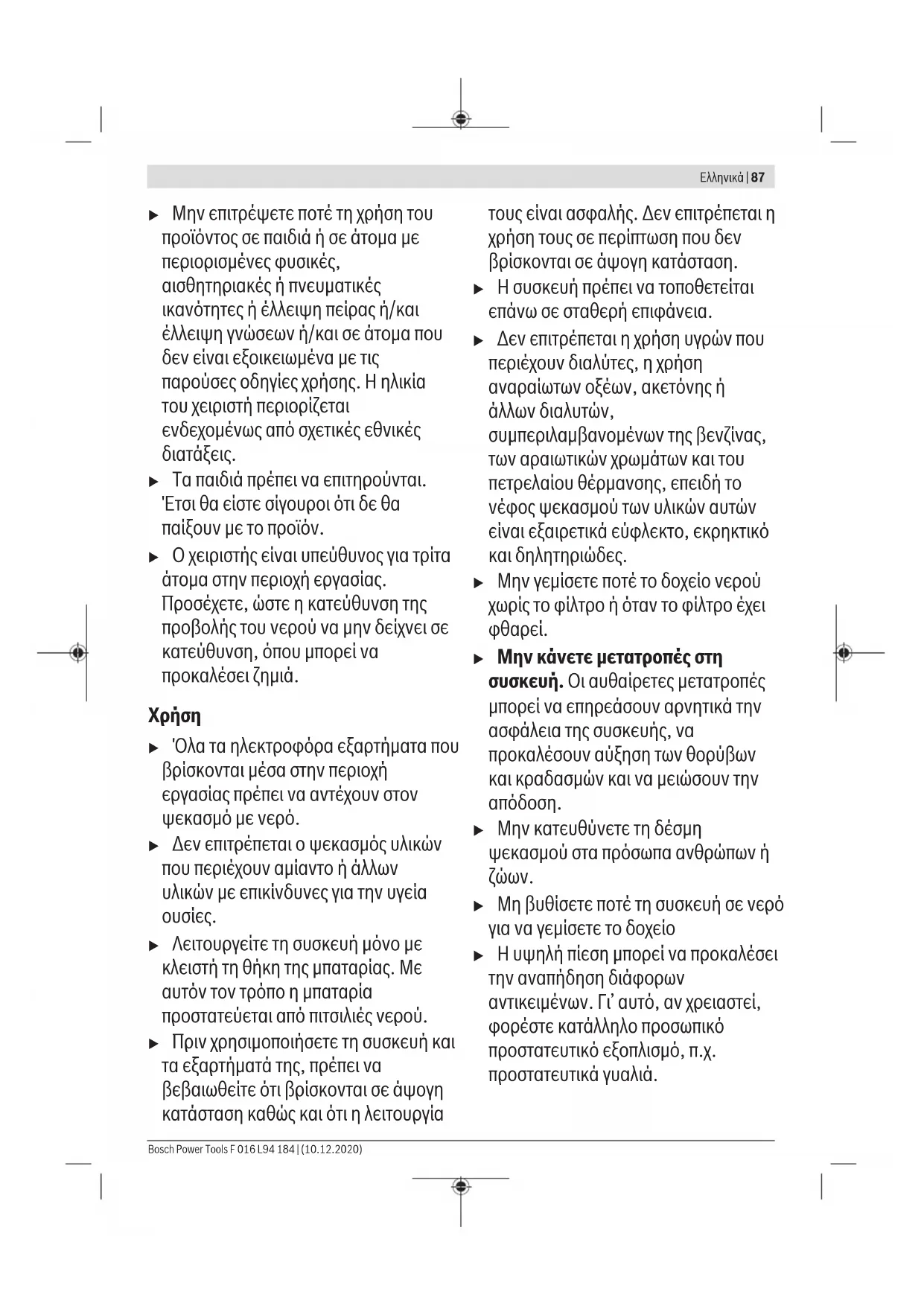 u Ο χειρισμός του προϊόντος επιτρέπεται μόνο για την ενδεικνυόμενη χρήση. Πρέπει να λαμβάνονται υπόψη οι εκάστοτε τοπικές συνθήκες. Κατά την εργασία πρέπει να δίνετε ευσυνείδητα προσοχή σε τυχόν παρευρισκόμενα άτομα, ιδιαίτερα δε σε παιδιά. F 016 L94 184 | (10.12.2020) Bosch Power ToolsΕλληνικά | 87 u Μην επιτρέψετε ποτέ τη χρήση του προϊόντος σε παιδιά ή σε άτομα με περιορισμένες φυσικές, αισθητηριακές ή πνευματικές ικανότητες ή έλλειψη πείρας ή/και έλλειψη γνώσεων ή/και σε άτομα που δεν είναι εξοικειωμένα με τις παρούσες οδηγίες χρήσης. Η ηλικία του χειριστή περιορίζεται ενδεχομένως από σχετικές εθνικές