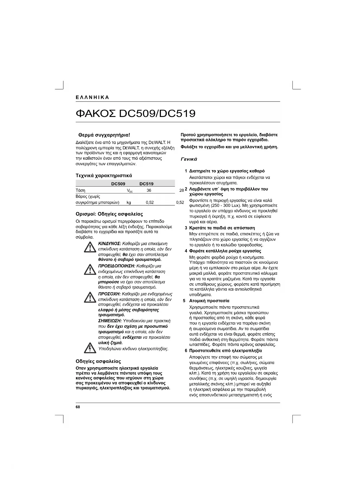 Θερμά συγχαρητήρια! Διαλέξατε ένα από τα μηχανήματα της DEWALT. Η πολύχρονη εμπειρία της D EWALT, η συνεχής εξέλιξη των προϊόντων της και η εφαρμογή καινοτομιών την καθιστούν έναν από τους πιό αξιόπιστους συνεργάτες των επαγγελματιών. Τεχνικά χαρακτηριστικά DC509 DC519 Τάση V