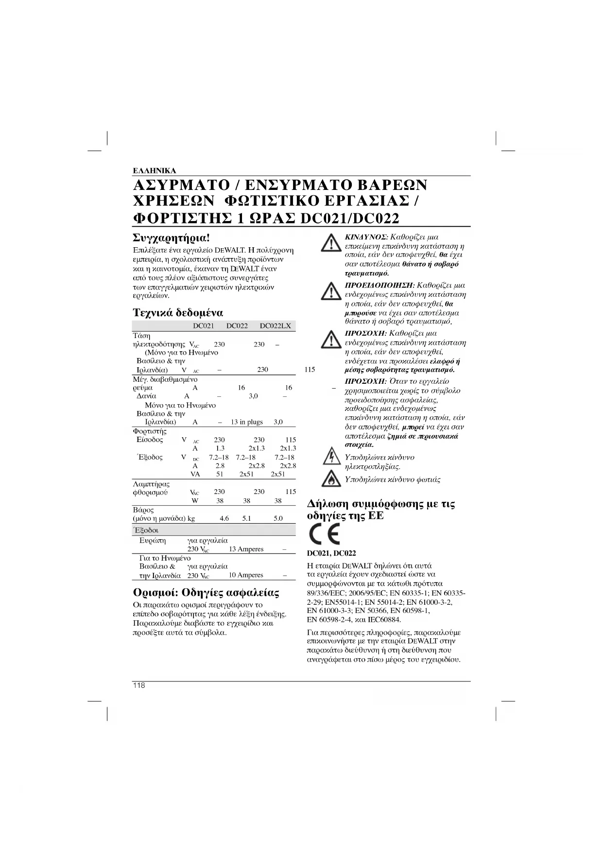 καρούλι τελείως. Πακέτο μπαταρίασ ΤΥΠΟΣ ΜΠΑΤΑΡΙΑΣ ΓΙΑ ΤΑ DC021 ΚΑΙ DC022 Το DC021 και το DC022 φορτίζουν πακέτα μπαταριών 7,2–18 Volt της D EWA LT και θα παρέχουν φωτισμό με τη χρήση πακέτων μπαταριών 12–18 Volt της D EWA LT. Ο χρόνος λειτουργίας για μια μπαταρία 18 V είναι μία ώρα ή και περισσότερος. Η μπαταρία σας μπορεί επίσης να φορτιστεί σε φορτιστές 1 ώρας της D EWA LT, σε φορτιστές 15 λεπτών, ή σε φορτιστές αυτοκινήτου των 12 V. Βεβαιωθείτε ότι έχετε διαβάσει όλες τις οδηγίες ασφαλείας πριν τη χρήση του φορτιστή σας. Το φωτιστικό εργασίας φθορισμού των 38 W λειτουργεί με μπαταρίες 12-18 V της D EWA LT ή σε παροχή ηλεκτροδότησης των 230 V και 115 V. Ο φορτιστής 1 ώρας και οι δύο πρίζες λειτουργούν ΜΟΝΟ, όταν το φωτιστικό εργασίας/φορτιστής είναι συνδεμένο σε πρίζα εναλλασσόμενου (AC) ρεύματος και ΔΕΝ ΜΠΟΡΕΙ να τροφοδοτηθεί από μπαταρίες της