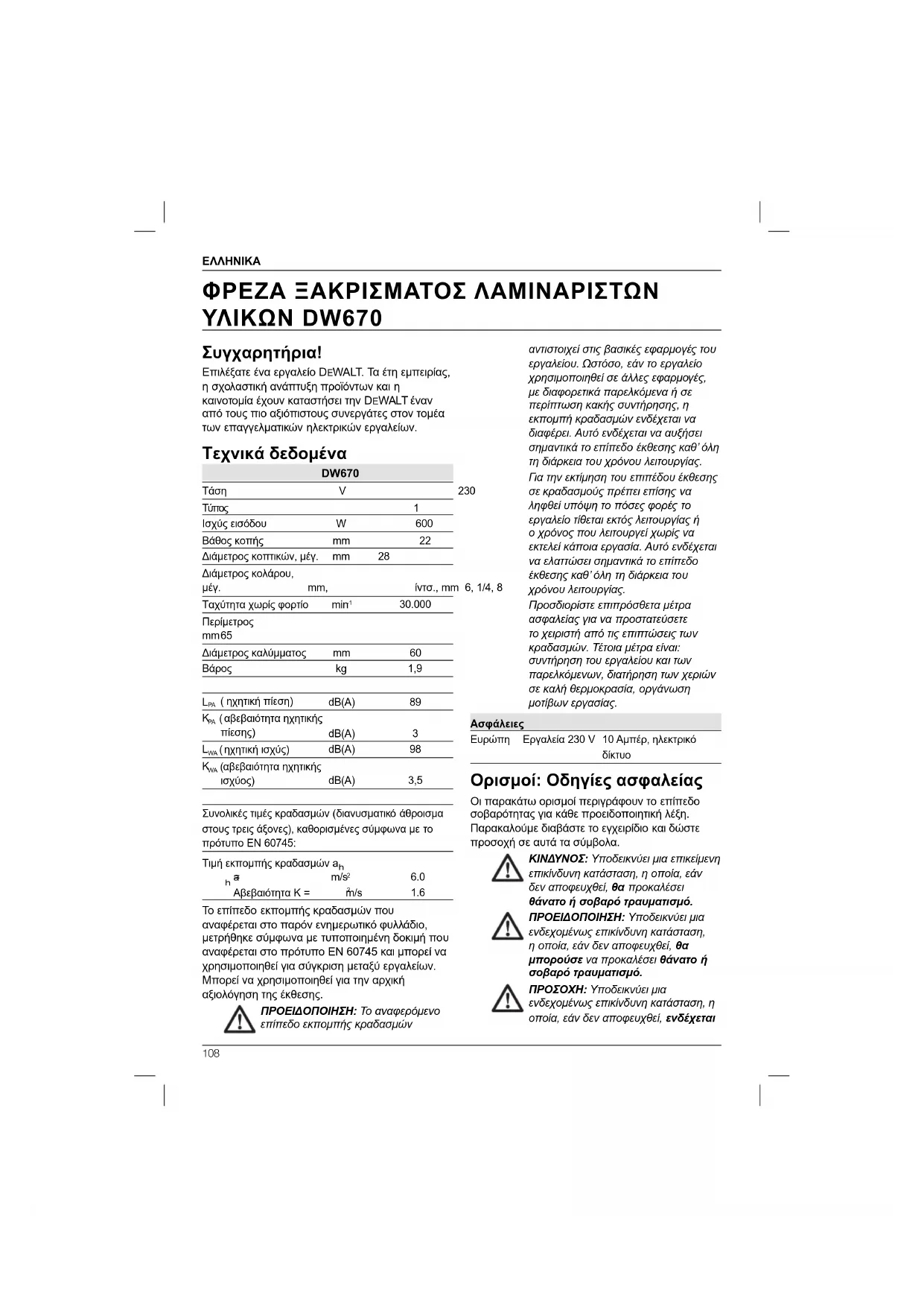 Συγχαρητήρια! Επιλέξατε ένα εργαλείο DEWALT. Τα έτη εμπειρίας, η σχολαστική ανάπτυξη προϊόντων και η καινοτομία έχουν καταστήσει την D EWALT έναν από τους πιο αξιόπιστους συνεργάτες στον τομέα των επαγγελματικών ηλεκτρικών εργαλείων. Τεχνικά δεδομένα DW670 Τάση V 230 Τύπος 1 Ισχύς εισόδου W 600 Βάθος κοπής mm 22 Διάμετρος κοπτικών, μέγ. mm 28 Διάμετρος κολάρου, μέγ. mm, ίντσ., mm 6, 1/4, 8 Ταχύτητα χωρίς φορτίο min