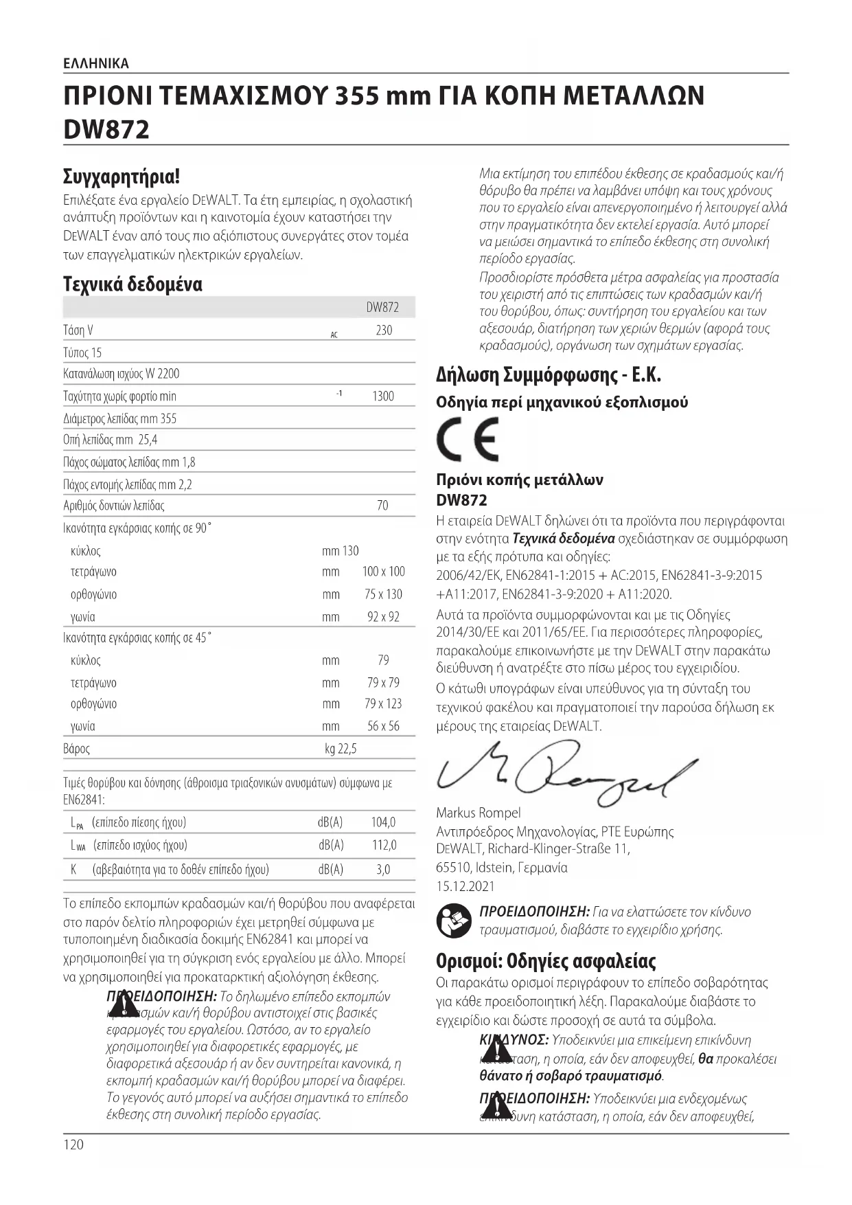 ΠΡΟΕΙΔΟΠΟΙΗΣΗ: Για να ελαττώσετε τον κίνδυνο τραυματισμού, διαβάστε το εγχειρίδιοχρήσης. Ορισμοί: Οδηγίες ασφαλείας Οι παρακάτω ορισμοί περιγράφουν το επίπεδο σοβαρότητας για κάθε προειδοποιητική λέξη. Παρακαλούμε διαβάστε το εγχειρίδιο και δώστε προσοχή σε αυτά τασύμβολα. ΚΙΝΔΥΝΟΣ: Υποδεικνύει μια επικείμενη επικίνδυνη κατάσταση, η οποία, εάν δεν αποφευχθεί, θα προκαλέσει θάνατο ή σοβαρότραυματισμό. ΠΡΟΕΙΔΟΠΟΙΗΣΗ: Υποδεικνύει μια ενδεχομένως επικίνδυνη κατάσταση, η οποία, εάν δεν αποφευχθεί, Δήλωση Συμμόρφωσης - Ε.Κ. Οδηγία περί μηχανικού εξοπλισμού Πριόνι κοπής μετάλλων DW872 Η εταιρεία DeWALT δηλώνει ότι τα προϊόντα που περιγράφονται στην ενότητα Τεχνικά δεδομένα σχεδιάστηκαν σε συμμόρφωση με τα εξής πρότυπα και οδηγίες: 2006/42/eK, EN62841-1:2015 + AC:2015, EN62841-3-9:2015 +A11:2017, EN62841-3-9:2020 + A11:2020.Αυτά τα προϊόντα συμμορφώνονται και με τις Οδηγίες 2014/30/ΕΕ και 2011/65/ΕΕ. Για περισσότερες πληροφορίες, παρακαλούμε επικοινωνήστε με την DeWALT στην παρακάτω διεύθυνση ή ανατρέξτε στο πίσω μέρος τουεγχειριδίου.Ο κάτωθι υπογράφων είναι υπεύθυνος για τη σύνταξη του τεχνικού φακέλου και πραγματοποιεί την παρούσα δήλωση εκ μέρους της εταιρείαςDeWALT.Markus Rompel Αντιπρόεδρος Μηχανολογίας, PTE Ευρώπης DeWALT, Richard-Klinger-Straße 11, 65510, Idstein, Γερμανία 15.12.2021Ελληνικά (μετάφραση από τις πρωτότυπες οδηγίες) ΠΡΙΟΝΙ ΤΕΜΑΧΙΣΜΟΥ 355 mm ΓΙΑ ΚΟΠΗ ΜΕΤΑΛΛΩΝ DW872 Συγχαρητήρια! Επιλέξατε ένα εργαλείο DeWALT. Τα έτη εμπειρίας, η σχολαστική ανάπτυξη προϊόντων και ηκαινοτομία έχουν καταστήσει την DeWALT έναν από τους πιο αξιόπιστους συνεργάτες στον τομέα των επαγγελματικών ηλεκτρικώνεργαλείων. Τεχνικά δεδομένα DW872Τάση V