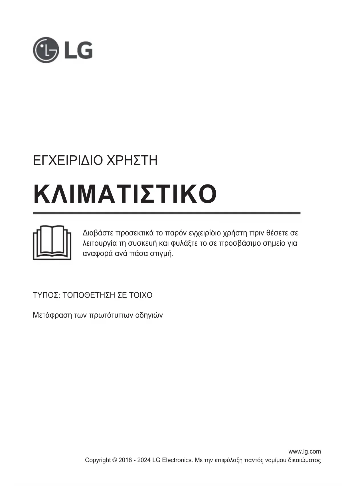 - Certaines fonctions peuvent ne pas être prises en charge en fonction du modèle.Notewww.lg.com ΕΓΧΕΙΡΙΔΙΟ ΧΡΗΣΤΗ Copyright © 2018 - 2024 LG Electronics. Με την επιφύλαξη παντός νομίμου δικαιώματος ΤΥΠΟΣ: ΤΟΠΟΘΕΤΗΣΗ ΣΕ ΤΟΙΧΟ Μετάφραση των πρωτότυπων οδηγιών Διαβάστε προσεκτικά το παρόν εγχειρίδιο χρήστη πριν θέσετε σε λειτουργία τη συσκευή και φυλάξτε το σε προσβάσιμο σημείο για αναφορά ανά πάσα στιγμή. ΚΛΙΜΑΤΙΣΤΙΚΟΠΙΝΑΚΑΣ ΠΕΡΙΕΧΟΜΕΝΩΝ Το εγχειρίδιο αυτό μπορεί να περιέχει εικόνες ή περιεχόμενο διαφορετικό από το μοντέλο που αγοράσατε. Το εγχειρίδιο υπόκειται σε αναθεώρηση από τον κατασκευαστή. ΟΔΗΓΙΕΣ ΑΣΦΑΛΕΙΑΣ ................................................................3 ΣΗΜΑΝΤΙΚΕΣ ΟΔΗΓΙΕΣ ΑΣΦΑΛΕΙΑΣ............................................................ 4 ΛΕΙΤΟΥΡΓΙΑ ...............................................................................11 Σημειώσεις για λειτουργία ............................................................................. 11 Εξαρτήματα και λειτουργίες ........................................................................... 11 Ασύρματο Τηλεχειριστήριο ............................................................................ 12 Αυτόματη επανεκκίνηση του Κλιματιστικού ................................................... 17 Χρήση του Τρόπου λειτουργίας .................................................................... 17 Χρήση του Τρόπου λειτουργίας Πίδακα ........................................................ 20 Χρήση της Λειτουργίας Ταχύτητας Ανεμιστήρα ............................................. 21 Χρήση της Λειτουργίας Κατεύθυνσης Ροής Αέρα ......................................... 21 Ρύθμιση του Χρονοδιακόπτη Ενεργοποίησης/Απενεργοποίησης ................. 22 Χρήση της Λειτουργίας Ύπνου (Προαιρετικό) ............................................... 23 Χρήση της Λειτουργίας Απλού Χρονοδιακόπτη (Προαιρετικό) ...................... 23 Χρήση της Λειτουργίας Προβολής Ενέργειας (Προαιρετικό) ......................... 24 Χρήση της Λειτουργίας Σβήσιμου Φωτός (Προαιρετικό) ............................... 24 Χρήση της Λειτουργίας Αέρα Άνεσης (Προαιρετικό) ...................................... 24 Χρήση της Λειτουργίας Ελέγχου Ενέργειας (Προαιρετικό) ............................ 25 Χρήση ειδικών λειτουργιών ...........................................................................25 ΕΞΥΠΝΕΣ ΛΕΙΤΟΥΡΓΙΕΣ ..........................................................27 Εφαρμογή LG ThinQ ..................................................................................... 27 Smart Diagnosis............................................................................................ 29 ΣΥΝΤΗΡΗΣΗ ...............................................................................30 Καθαρίστε το Φίλτρο Αέρα ............................................................................ 32 Καθαρίστε το φίλτρο Αντιαλλεργιών (Προαιρετικό) ....................................... 33 ΕΠΙΛΥΣΗ ΠΡΟΒΛΗΜΑΤΩΝ .......................................................343 ΟΔΗΓΙΕΣ ΑΣΦΑΛΕΙΑΣ