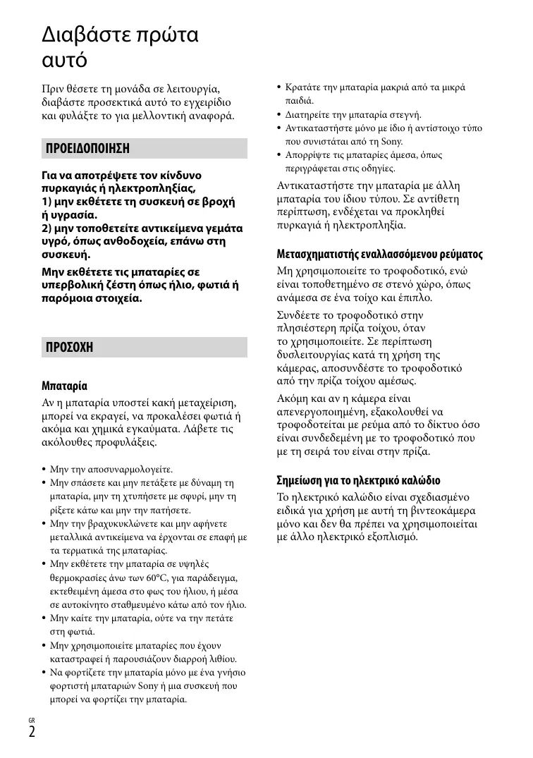 Μην την απoσυναρμoλoγείτε. Μην σπάσετε και μην πετάξετε με δύναμη τη μπαταρία, μην τη χτυπήσετε με σφυρί, μην τη ρίξετε κάτω και μην την πατήσετε. Μην την βραχυκυκλώνετε και μην αφήνετε μεταλλικά αντικείμενα να έρχονται σε επαφή με τα τερματικά της μπαταρίας. Μην εκθέτετε την μπαταρία σε υψηλές θερμοκρασίες άνω των 60°C, για παράδειγμα, εκτεθειμένη άμεσα στο φως του ήλιου, ή μέσα σε αυτοκίνητο σταθμευμένο κάτω από τον ήλιο. Μην καίτε την μπαταρία, ούτε να την πετάτε Μην χρησιμοποιείτε μπαταρίες που έχουν καταστραφεί ή παρουσιάζουν διαρροή λιθίου. Να φορτίζετε την μπαταρία μόνο με ένα γνήσιο φορτιστή μπαταριών Sony ή μια συσκευή που μπορεί να φορτίζει την μπαταρία.