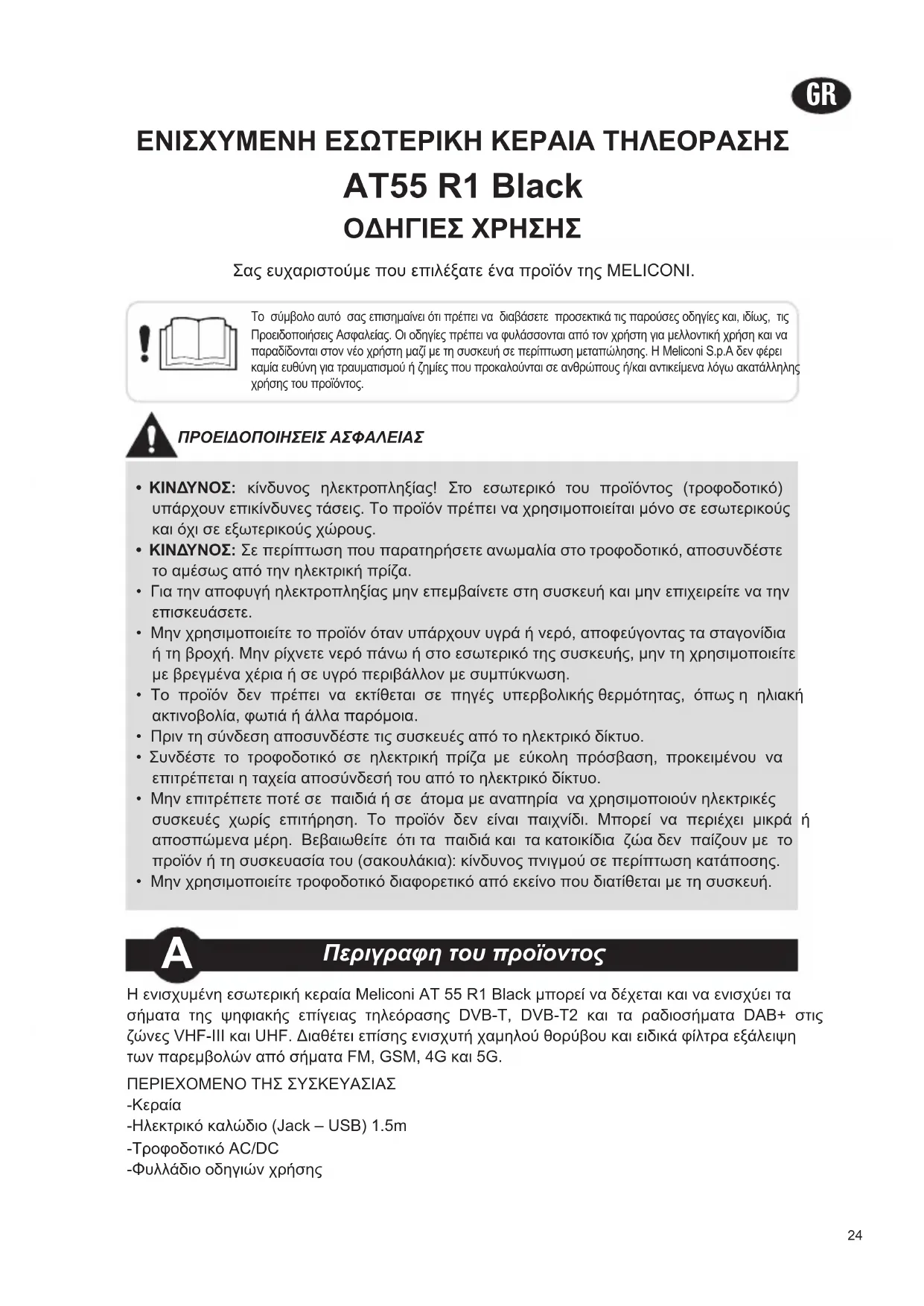 ΕΝΙΣΧΥΜΕΝΗ ΕΣΩΤΕΡΙΚΗ ΚΕΡΑΙΑ ΤΗΛΕΟΡΑΣΗΣ AT55 R1 Black ΟΔΗΓΙΕΣ ΧΡΗΣΗΣ Σας ευχαριστούμε που επιλέξατε ένα προϊόν της MELICONI. Η ενισχυμένη εσωτερική κεραία Meliconi AT 55 R1 Black μπορεί να δέχεται και να ενισχύει τα σήματα της ψηφιακής επίγειας τηλεόρασης DVB-T, DVB-T2 και τα ραδιοσήματα DAB+ στις ζώνες VHF-III και UHF. Διαθέτει επίσης ενισχυτή χαμηλού θορύβου και ειδικά φίλτρα εξάλειψη των παρεμβολών από σήματα FM, GSM, 4G και 5G.ΠΕΡΙΕΧΟΜΕΝΟ ΤΗΣ ΣΥΣΚΕΥΑΣΙΑΣ -Κεραία -Ηλεκτρικό καλώδιο (Jack – USB) 1.5m-Τροφοδοτικό AC/DC -Φυλλάδιο οδηγιών χρήσης