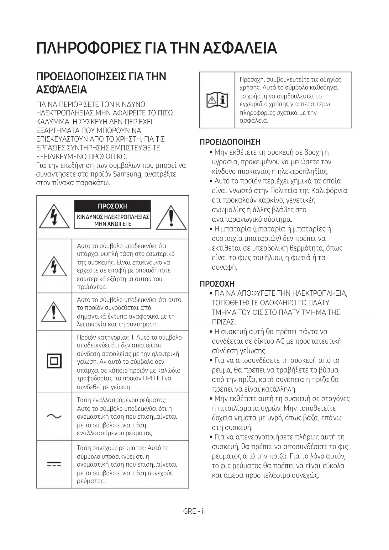 ΓΙΑ ΝΑ ΠΕΡΙΟΡΙΣΕΤΕ ΤΟΝ ΚΙΝΔΥΝΟ ΗΛΕΚΤΡΟΠΛΗΞΙΑΣ ΜΗΝ ΑΦΑΙΡΕΙΤΕ ΤΟ ΠΙΣΩ ΚΑΛΥΜΜΑ. Η ΣΥΣΚΕΥΗ ΔΕΝ ΠΕΡΙΕΧΕΙ ΕΞΑΡΤΗΜΑΤΑ ΠΟΥ ΜΠΟΡΟΥΝ ΝΑ ΕΠΙΣΚΕΥΑΣΤΟΥΝ ΑΠΟ ΤΟ ΧΡΗΣΤΗ. ΓΙΑ ΤΙΣ ΕΡΓΑΣΙΕΣ ΣΥΝΤΗΡΗΣΗΣ ΕΜΠΙΣΤΕΥΘΕΙΤΕ ΕΞΕΙΔΙΚΕΥΜΕΝΟ ΠΡΟΣΩΠΙΚΟ. Για την επεξήγηση των συμβόλων που μπορεί να συναντήσετε στο προϊόν Samsung, ανατρέξτε στον πίνακα παρακάτω.