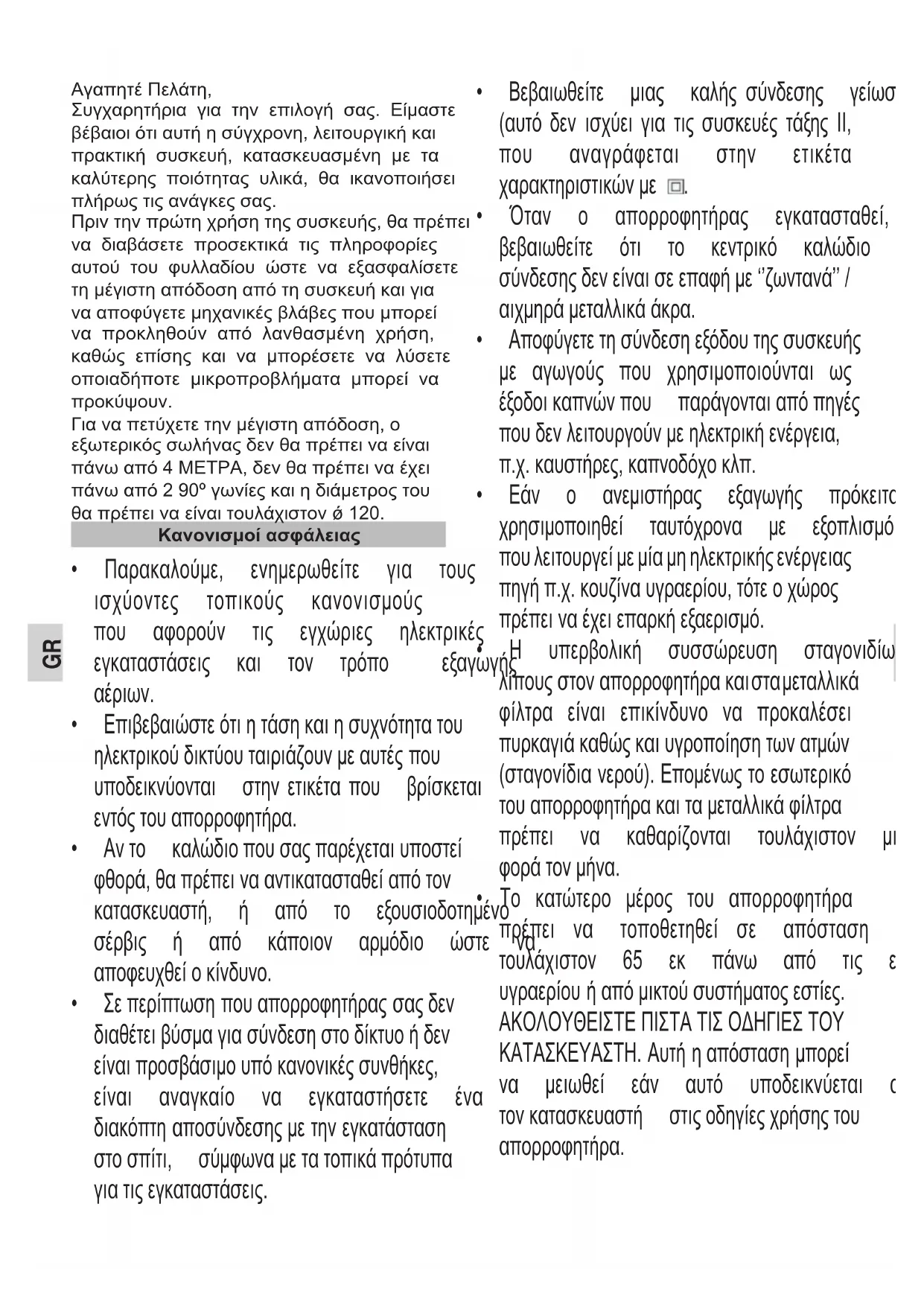 - Ο απορροφητήρας είναι σχεδιασμένος για οικιακή χρήση και μόνο για την αποβολή και τον καθαρισμό των οσμών που δημιουργούνται από την ετοιμασία του φαγητού.Ηχρήσητουγιαοποιονδήποτεάλλο σκοπόείναιμεδικήσαςευθύνηκαιμπορεί νααποδειχθείεπικίνδυνη.Οκατασκευαστής δενμπορείναθεωρηθείυπεύθυνοςγιαζημιά πουέχειπροκληθείαπόακατάλληληχρήση τηςσυσκευής.