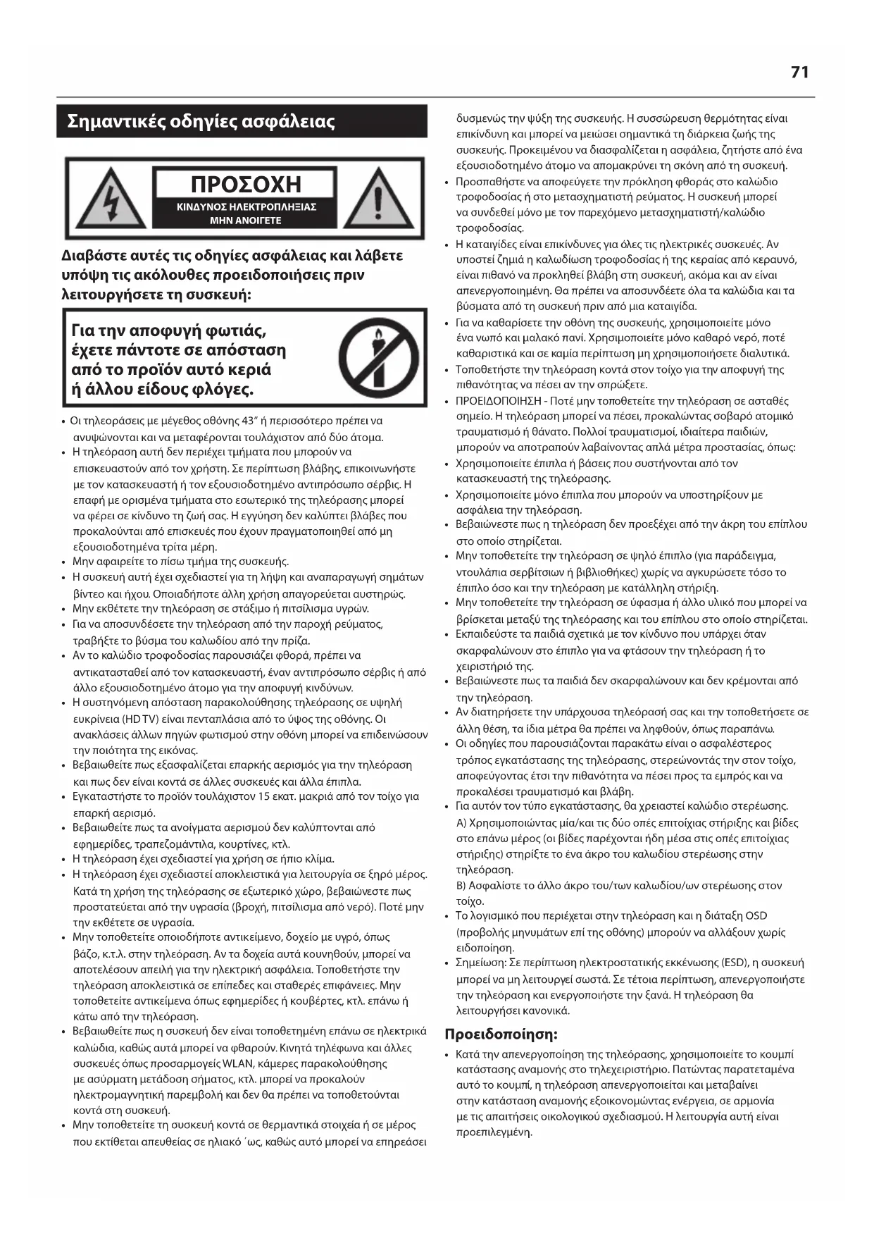 - Κατά την απενεργοποίηση της τηλεόρασης, χρησιμοποιείτε το κουμπί κατάστασης αναμονής στο τηλεχειριστήριο. Πατώντας παρατεταμένα αυτό το κουμπί, η τηλεόραση απενεργοποιείται και μεταβαίνει στην κατάσταση αναμονής εξοικονομώντας ενέργεια, σε αρμονία με τις απαιτήσεις οικολογικού σχεδιασμού. Η λειτουργία αυτή είναι προεπιλεγμένη. 71• Μην χρησιμοποιείτε την τηλεόραση απευθείας μόλις την αφαιρέσετε από τη συσκευασία. Περιμένετε ώσπου να ζεσταθεί η τηλεόραση σε θερμοκρασία δωματίου πριν την χρησιμοποιήσετε.