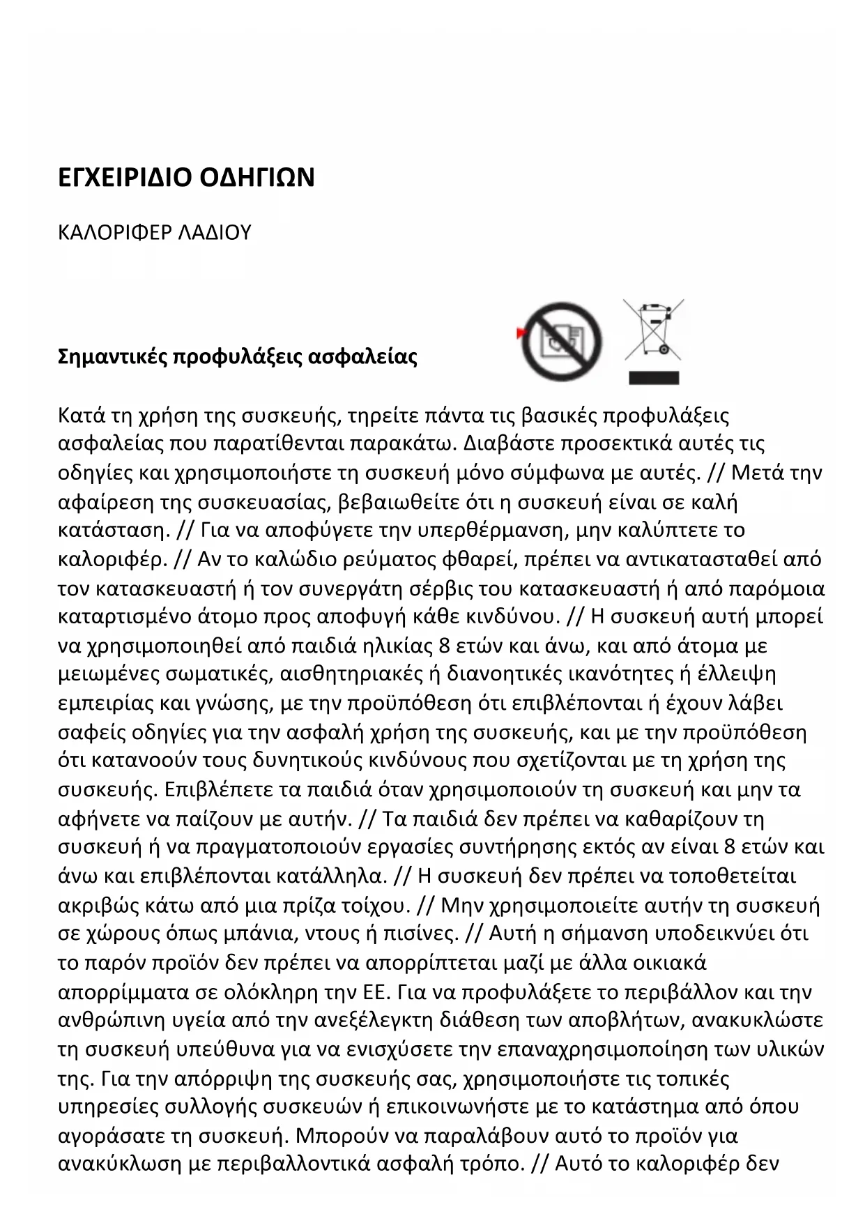 du behöver information eller har ett problem, kontakta Gorenjes kundcenter i ditt land (du hittar telefonnumret i det internationella garantibladet). Om inget sådant center finns i ditt land, kontakta närmaste Gorenje-återförsäljare eller Gorenjes avdelning för hushållsapparater. Endast för privat bruk! GOR ENJE ÖNSKAR DIG MYCKET NÖJE NÄR DU ANVÄNDER DITT ELEMENT!ΕΓΧΕΙΡΙΔΙΟ ΟΔΗΓΙΩΝ ΚΑΛΟΡΙΦΕΡ ΛΑΔΙΟΥ Σημαντικές προφυλάξεις ασφαλείας Κατά τη χρήση της συσκευής, τηρείτε πάντα τις βασικές προφυλάξεις ασφαλείας που παρατίθενται παρακάτω. Διαβάστε προσεκτικά αυτές τις οδηγίες και χρησιμοποιήστε τη συσκευή μόνο σύμφωνα με αυτές. // Μετά την αφαίρεση της συσκευασίας, βεβαιωθείτε ότι η συσκευή είναι σε καλή κατάσταση. // Για να αποφύγετε την υπερθέρμανση, μην καλύπτετε το καλοριφέρ. // Αν το καλώδιο ρεύματος φθαρεί, πρέπει να αντικατασταθεί από τον κατασκευαστή ή τον συνεργάτη σέρβις του κατασκευαστή ή από παρόμοια καταρτισμένο άτομο προς αποφυγή κάθε κινδύνου. // Η συσκευή αυτή μπορεί να χρησιμοποιηθεί από παιδιά ηλικίας 8 ετών και άνω, και από άτομα με μειωμένες σωματικές, αισθητηριακές ή διανοητικές ικανότητες ή έλλειψη εμπειρίας και γνώσης, με την προϋπόθεση ότι επιβλέπονται ή έχουν λάβει σαφείς οδηγίες για την ασφαλή χρήση της συσκευής, και με την προϋπόθεση ότι κατανοούν τους δυνητικούς κινδύνους που σχετίζονται με τη χρήση της συσκευής. Επιβλέπετε τα παιδιά όταν χρησιμοποιούν τη συσκευή και μην τα αφήνετε να παίζουν με αυτήν. // Τα παιδιά δεν πρέπει να καθαρίζουν τη συσκευή ή να πραγματοποιούν εργασίες συντήρησης εκτός αν είναι 8 ετών και άνω και επιβλέπονται κατάλληλα. // Η συσκευή δεν πρέπει να τοποθετείται ακριβώς κάτω από μια πρίζα τοίχου. // Μην χρησιμοποιείτε αυτήν τη συσκευή σε χώρους όπως μπάνια, ντους ή πισίνες. // Αυτή η σήμανση υποδεικνύει ότι το παρόν προϊόν δεν πρέπει να απορρίπτεται μαζί με άλλα οικιακά απορρίμματα σε ολόκληρη την ΕΕ. Για να προφυλάξετε το περιβάλλον και την ανθρώπινη υγεία από την ανεξέλεγκτη διάθεση των αποβλήτων, ανακυκλώστε τη συσκευή υπεύθυνα για να ενισχύσετε την επαναχρησιμοποίηση των υλικών της. Για την απόρριψη της συσκευής σας, χρησιμοποιήστε τις τοπικές υπηρεσίες συλλογής συσκευών ή επικοινωνήστε με το κατάστημα από όπου αγοράσατε τη συσκευή. Μπορούν να παραλάβουν αυτό το προϊόν για ανακύκλωση με περιβαλλοντικά ασφαλή τρόπο. // Αυτό το καλοριφέρ δενμπορεί να επιτύχει ακριβή έλεγχο της θερμοκρασίας περιβάλλοντος και κατά συνέπεια δεν μπορεί να χρησιμοποιηθεί ως μονωτική συσκευή για περιβάλλοντα αποθήκευσης, αντικείμενα, ζώα και φυτά. // Αυτό το καλοριφέρ είναι γεμάτο με συγκεκριμένη ποσότητα ειδικού λαδιού. Επισκευές που απαιτούν το άνοιγμα του δοχείου λαδιού πρέπει να πραγματοποιούνται μόνο από τον κατασκευαστή ή τον συνεργάτη σέρβις του κατασκευαστή στον οποίο πρέπει να αποταθείτε αν παρουσιαστεί διαρροή λαδιού. Κατά την απόρριψη της συσκευής, τηρήστε τους κανονισμούς που αφορούν την απόρριψη λαδιού. // 10. Αυτό το καλοριφέρ δεν μπορεί να επιτύχει ακριβή έλεγχο της θερμοκρασίας περιβάλλοντος και κατά συνέπεια δεν μπορεί να χρησιμοποιηθεί ως μονωτική συσκευή για περιβάλλοντα αποθήκευσης, αντικείμενα, ζώα και φυτά. // Η συσκευή προορίζεται για οικιακή χρήση μόνο.