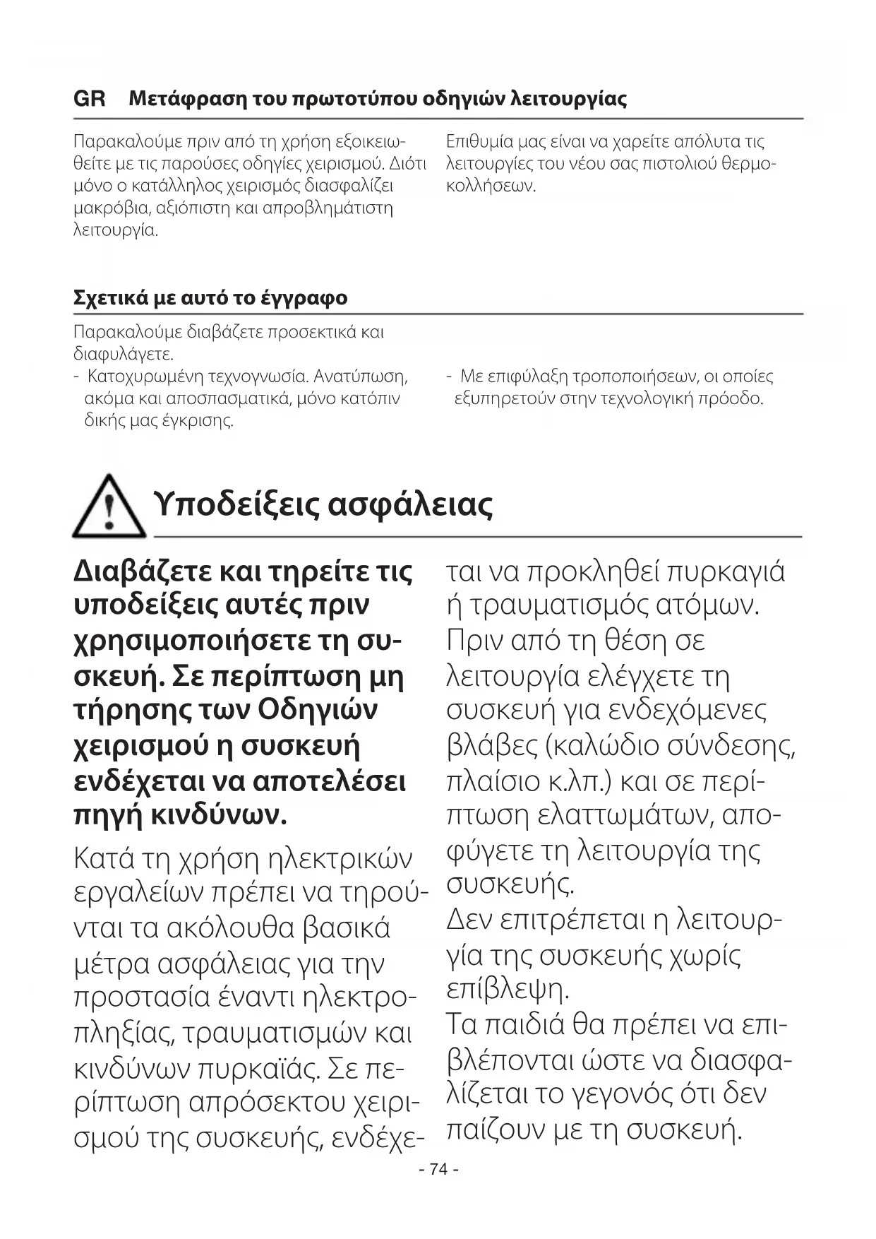 Μετάφραση του πρωτοτύπου οδηγιών λειτουργίας Σχετικά με αυτό το έγγραφο Παρακαλούμε διαβάζετε προσεκτικά και διαφυλάγετε. - Κατοχυρωμένη τεχνογνωσία. Ανατύπωση, ακόμα και αποσπασματικά, μόνο κατόπιν δικής μας έγκρισης. - Με επιφύλαξη τροποποιήσεων, οι οποίες εξυπηρετούν στην τεχνολογική πρόοδο. Υποδείξεις ασφάλειας GR- 75 -