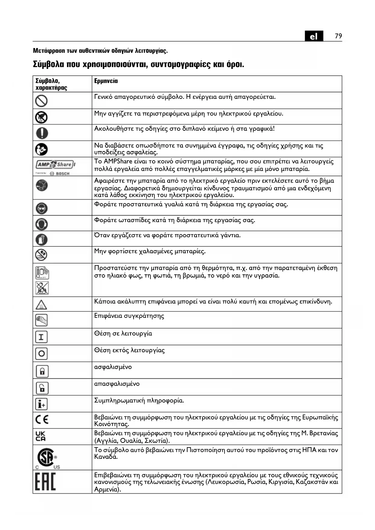 Γενικό απαγορευτικό σύμβολο. Η ενέργεια αυτή απαγορεύεται. Μην αγγίζετε τα περιστρεφόμενα μέρη του ηλεκτρικού εργαλείου. Ακολουθήστε τις οδηγίες στο διπλανό κείμενο ή στα γραφικά! Να διαβάσετε οπωσδήποτε τα συνημμένα έγγραφα, τις οδηγίες χρήσης και τις υποδείξεις ασφαλείας. Το AMPShare είναι το κοινό σύστημα μπαταρίας, που σου επιτρέπει να λειτουργείς πολλά εργαλεία από πολλές επαγγελματικές μάρκες με μία μόνο μπαταρία. Αφαιρέστε την μπαταρία από το ηλεκτρικό εργαλείο πριν εκτελέσετε αυτό το βήμα εργασίας. Διαφορετικά δημιουργείται κίνδυνος τραυματισμού από μια ενδεχόμενη κατά λάθος εκκίνηση του ηλεκτρικού εργαλείου. Φοράτε προστατευτικά γυαλιά κατά τη διάρκεια της εργασίας σας. Φοράτε ωτασπίδες κατά τη διάρκεια της εργασίας σας. Όταν εργάζεστε να φοράτε προστατευτικά γάντια. Μην φορτίσετε χαλασμένες μπαταρίες. Προστατεύστε την μπαταρία από τη θερμότητα, π.χ. από την παρατεταμένη έκθεση στο ηλιακό φως, τη φωτιά, τη βρωμιά, το νερό και την υγρασία. Κάποια ακάλυπτη επιφάνεια μπορεί να είναι πολύ καυτή και επομένως επικίνδυνη. Επιφάνεια συγκράτησης Θέση σε λειτουργία Θέση εκτός λειτουργίας ασφαλισμένο απασφαλισμένο Συμπληρωματική πληροφορία. Βεβαιώνει τη συμμόρφωση του ηλεκτρικού εργαλείου με τις οδηγίες της Ευρωπαϊκής Κοινότητας. Βεβαιώνει τη συμμόρφωση του ηλεκτρικού εργαλείου με τις οδηγίες της Μ. Βρετανίας (Αγγλία, Ουαλία, Σκωτία). Το σύμβολο αυτό βεβαιώνει την Πιστοποίηση αυτού του προϊόντος στις ΗΠΑ και τον