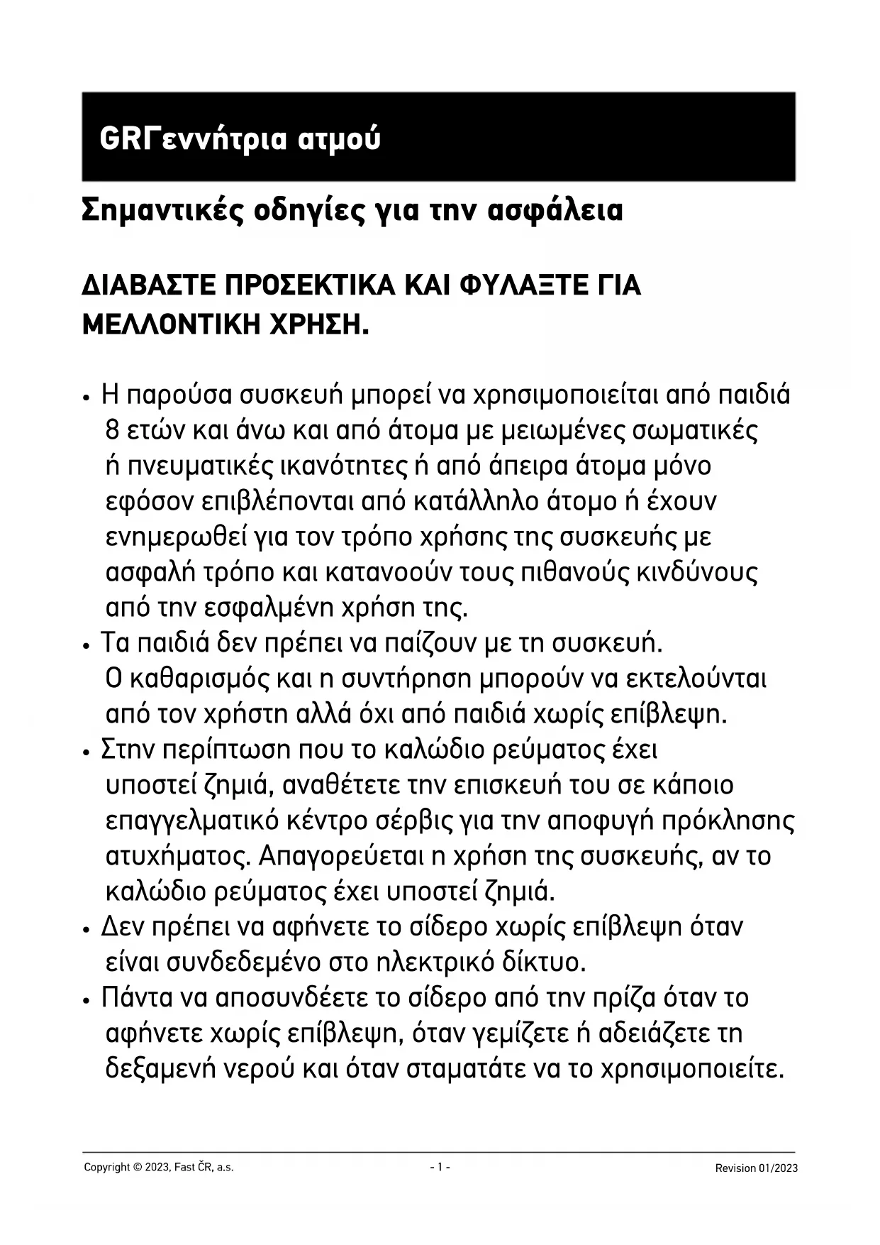 Revision 01/2023 Copyright © 2023, Fast ČR, a.s. GR Γεννήτρια ατμού Σημαντικές οδηγίες για την ασφάλεια ΔΙΑΒΑΣΤΕ ΠΡΟΣΕΚΤΙΚΑ ΚΑΙ ΦΥΛΑΞΤΕ ΓΙΑ ΜΕΛΛΟΝΤΙΚΗ ΧΡΗΣΗ.