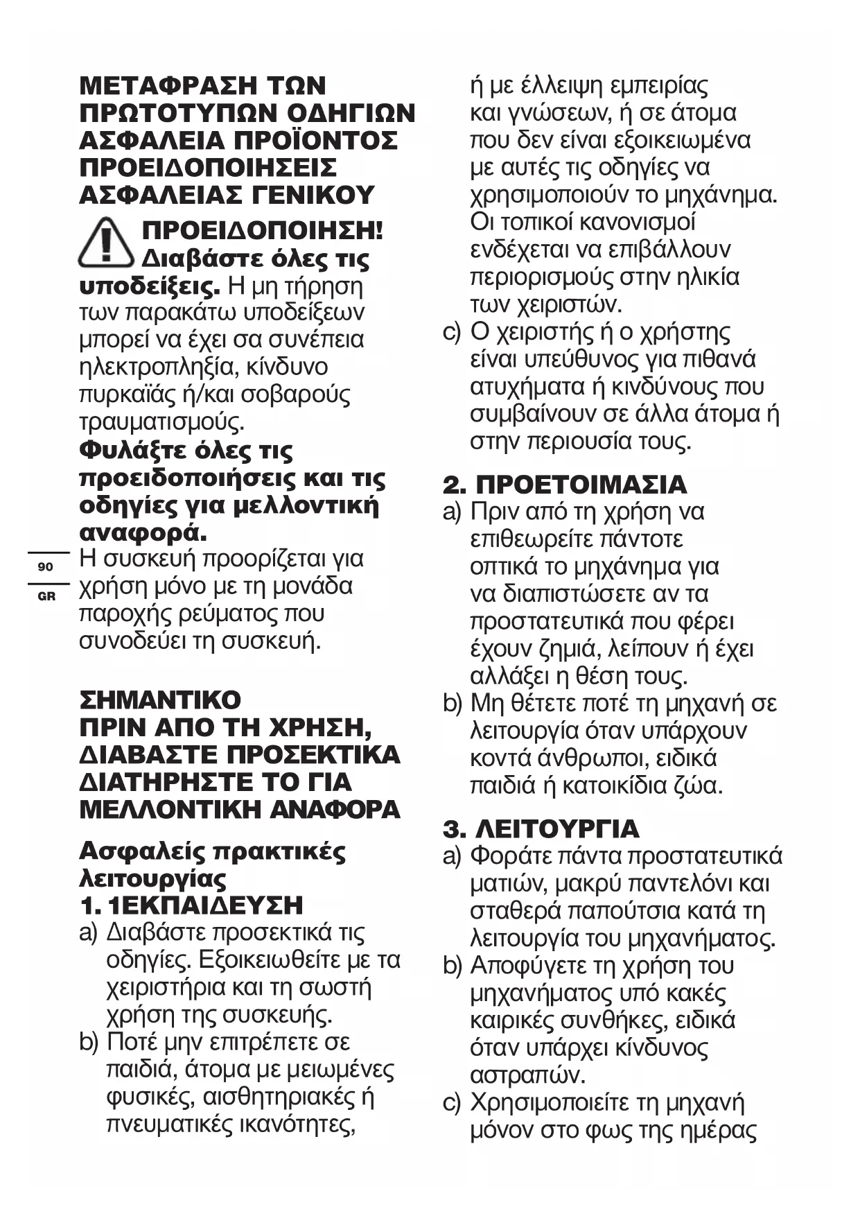 ΜΕΤΑΦΡΑΣΗ ΤΩΝ ΠΡΩΤΟΤΥΠΩΝ ΟΔΗΓΙΩΝ ΑΣΦΑΛΕΙΑ ΠΡΟΪΟΝΤΟΣ ΠΡΟΕΙΔΟΠΟΙΗΣΕΙΣ ΑΣΦΑΛΕΙΑΣ ΓΕΝΙΚΟΥ ΠΡΟΕΙΔΟΠΟΙΗΣΗ! Διαβάστε όλες τις υποδείξεις. Η μη τήρηση των παρακάτω υποδείξεων μπορεί να έχει σα συνέπεια ηλεκτροπληξία, κίνδυνο πυρκαϊάς ή/και σοβαρούς τραυματισμούς. Φυλάξτε όλες τις προειδοποιήσεις και τις οδηγίες για μελλοντική