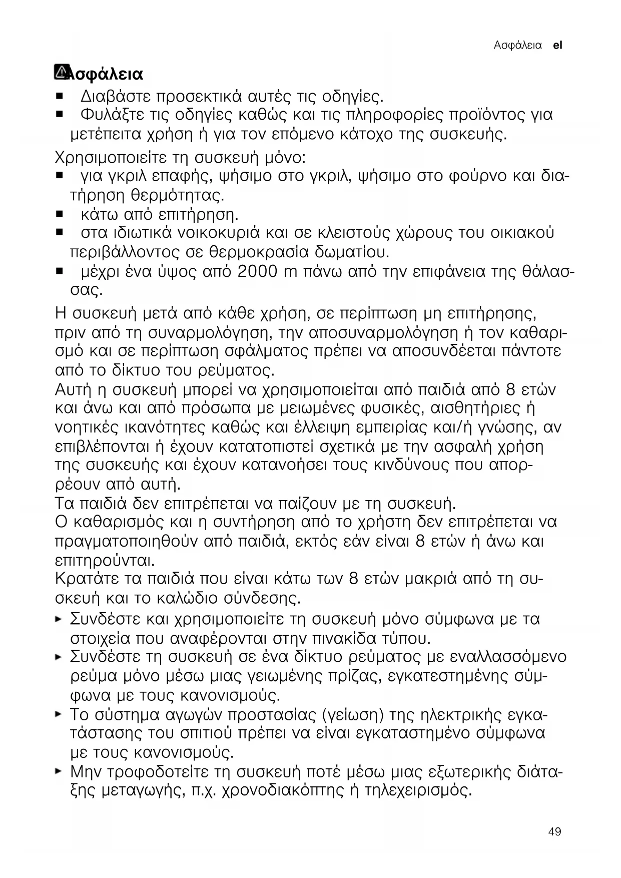 Η συσκευή μετά από κάθε χρήση, σε περίπτωση μη επιτήρησης, πριν από τη συναρμολόγηση, την αποσυναρμολόγηση ή τον καθαρι- σμό και σε περίπτωση σφάλματος πρέπει να αποσυνδέεται πάντοτε από το δίκτυο του ρεύματος. Αυτή η συσκευή μπορεί να χρησιμοποιείται από παιδιά από 8 ετών και άνω και από πρόσωπα με μειωμένες φυσικές, αισθητήριες ή νοητικές ικανότητες καθώς και έλλειψη εμπειρίας και/ή γνώσης, αν επιβλέπονται ή έχουν κατατοπιστεί σχετικά με την ασφαλή χρήση της συσκευής και έχουν κατανοήσει τους κινδύνους που απορ- ρέουν από αυτή. Τα παιδιά δεν επιτρέπεται να παίζουν με τη συσκευή. Ο καθαρισμός και η συντήρηση από το χρήστη δεν επιτρέπεται να πραγματοποιηθούν από παιδιά, εκτός εάν είναι 8 ετών ή άνω και επιτηρούνται. Κρατάτε τα παιδιά που είναι κάτω των 8 ετών μακριά από τη συ- σκευή και το καλώδιο σύνδεσης. Συνδέστε και χρησιμοποιείτε τη συσκευή μόνο σύμφωνα με τα στοιχεία που αναφέρονται στην πινακίδα τύπου. Συνδέστε τη συσκευή σε ένα δίκτυο ρεύματος με εναλλασσόμενο ρεύμα μόνο μέσω μιας γειωμένης πρίζας, εγκατεστημένης σύμ- φωνα με τους κανονισμούς. Το σύστημα αγωγών προστασίας (γείωση) της ηλεκτρικής εγκα- τάστασης του σπιτιού πρέπει να είναι εγκαταστημένο σύμφωνα με τους κανονισμούς. Μην τροφοδοτείτε τη συσκευή ποτέ μέσω μιας εξωτερικής διάτα- ξης μεταγωγής, π.χ. χρονοδιακόπτης ή τηλεχειρισμός. 49el Αποφυγή των υλικών ζημιών Μόνο εκπαιδευμένο γι’ αυτό, ειδικευμένο προσωπικό επιτρέπεται να πραγματοποιήσει επισκευές στη συσκευή. Εάν το καλώδιο σύνδεσης στο δίκτυο του ρεύματος αυτής της συσκευής υποστεί ζημιά, πρέπει να αντικατασταθεί από τον κατα- σκευαστή ή την υπηρεσία εξυπηρέτησης πελατών του ή από ένα αντίστοιχα ειδικευμένο άτομο, για την αποφυγή επικινδύνων κα-