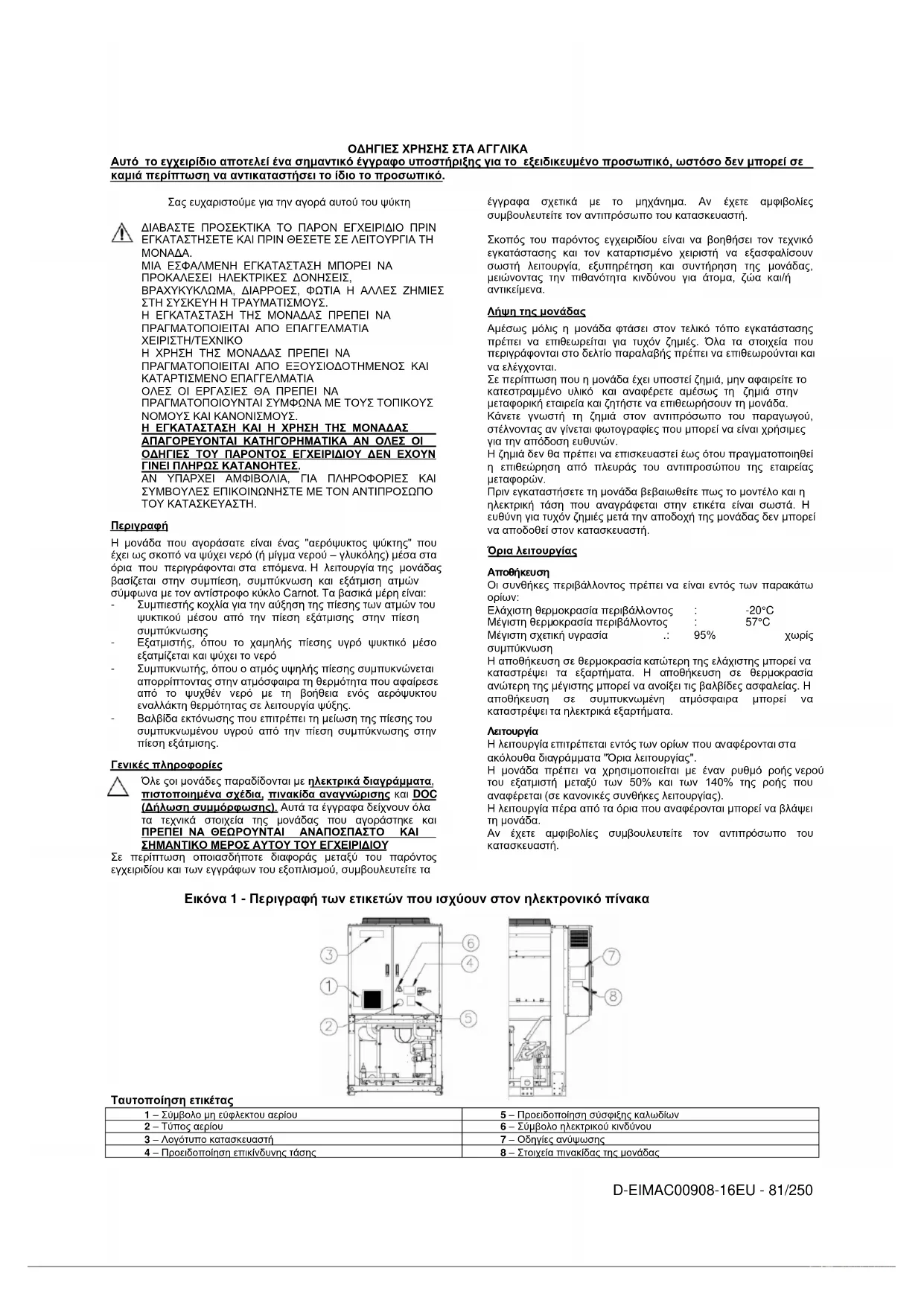 Ταυτοποίηση ετικέτας 1 – Σύμβολο μη εύφλεκτου αερίου 5 – Προειδοποίηση σύσφιξης καλωδίων 2 – Τύπος αερίου 6 – Σύμβολο ηλεκτρικού κινδύνου 3 – Λογότυπο κατασκευαστή 7 – Οδηγίες ανύψωσης 4 – Προειδοποίηση επικίνδυνης τάσης 8 – Στοιχεία πινακίδας της μονάδαςD-EIMAC00908-16EU - 82/250