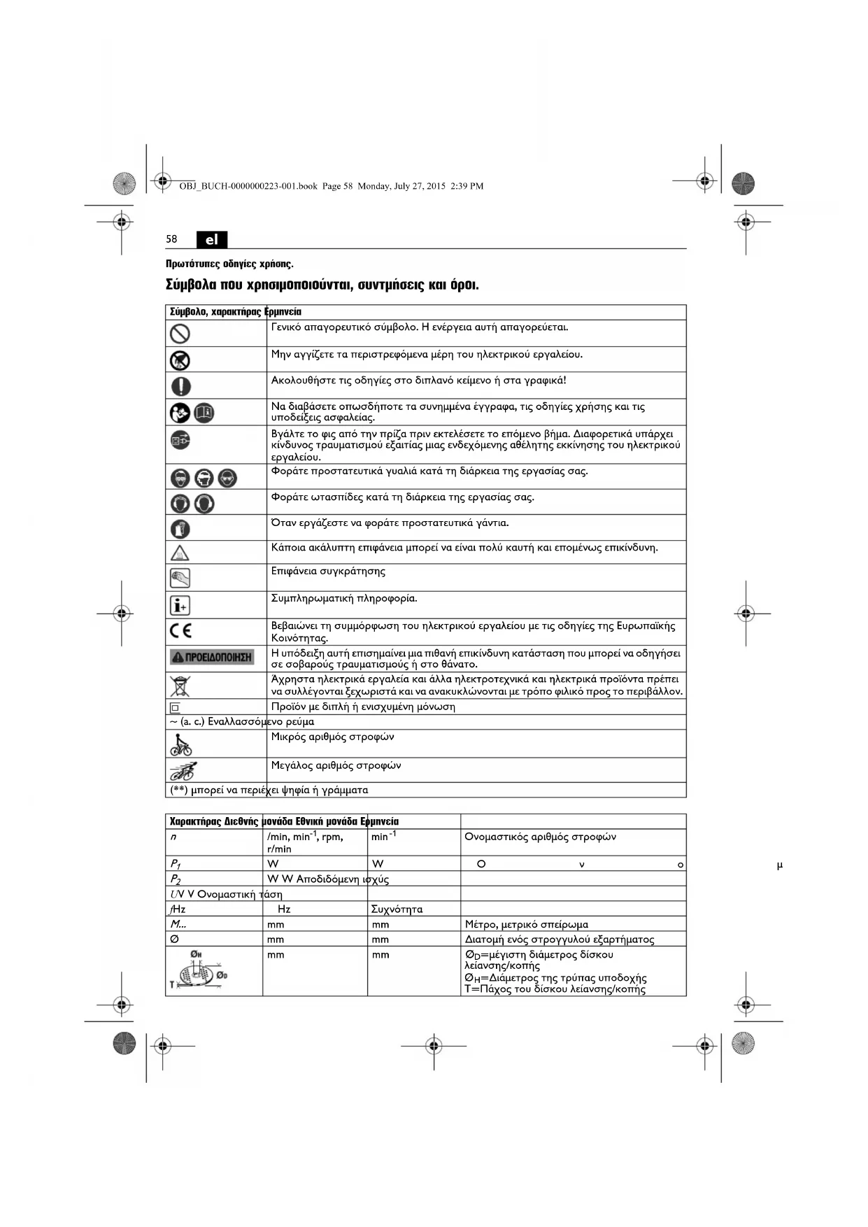 Πρωτότυπες οδηγίες χρήσης. Σύμβολα που χρησιμοποιούνται, συντμήσεις και όροι. Σύμβολο, χαρακτήρας Ερμηνεία Γενικό απαγορευτικό σύμβολο. Η ενέργεια αυτή απαγορεύεται. Μην αγγίζετε τα περιστρεφόμενα μέρη του ηλεκτρικού εργαλείου. Ακολουθήστε τις οδηγίες στο διπλανό κείμενο ή στα γραφικά! Να διαβάσετε οπωσδήποτε τα συνημμένα έγγραφα, τις οδηγίες χρήσης και τις υποδείξεις ασφαλείας. Βγάλτε το φις από την πρίζα πριν εκτελέσετε το επόμενο βήμα. Διαφορετικά υπάρχει κίνδυνος τραυματισμού εξαιτίας μιας ενδεχόμενης αθέλητης εκκίνησης του ηλεκτρικού