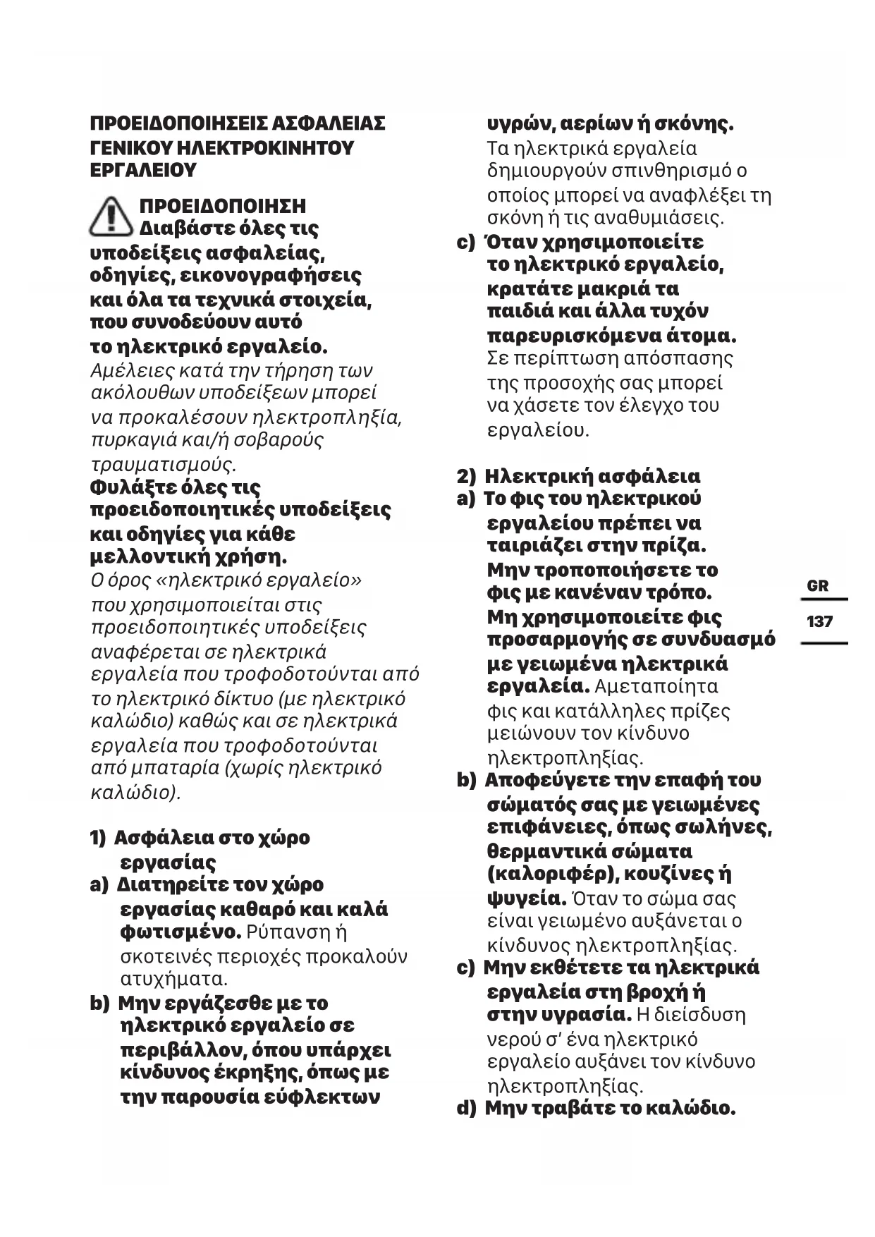 a) Το φις του ηλεκτρικού εργαλείου πρέπει να ταιριάζει στην πρίζα. Μην τροποποιήσετε το φις με κανέναν τρόπο. Μη χρησιμοποιείτε φις προσαρμογής σε συνδυασμό με γειωμένα ηλεκτρικά εργαλεία. Αμεταποίητα φις και κατάλληλες πρίζες μειώνουν τον κίνδυνο ηλεκτροπληξίας. b) Αποφεύγετε την επαφή του σώματός σας με γειωμένες επιφάνειες, όπως σωλήνες, θερμαντικά σώματα (καλοριφέρ), κουζίνες ή ψυγεία. Όταν το σώμα σας είναι γειωμένο αυξάνεται ο κίνδυνος ηλεκτροπληξίας. c) Μην εκθέτετε τα ηλεκτρικά εργαλεία στη βροχή ή στην υγρασία. Η διείσδυση νερού σ’ ένα ηλεκτρικό εργαλείο αυξάνει τον κίνδυνο ηλεκτροπληξίας. d) Μην τραβάτε το καλώδιο.138