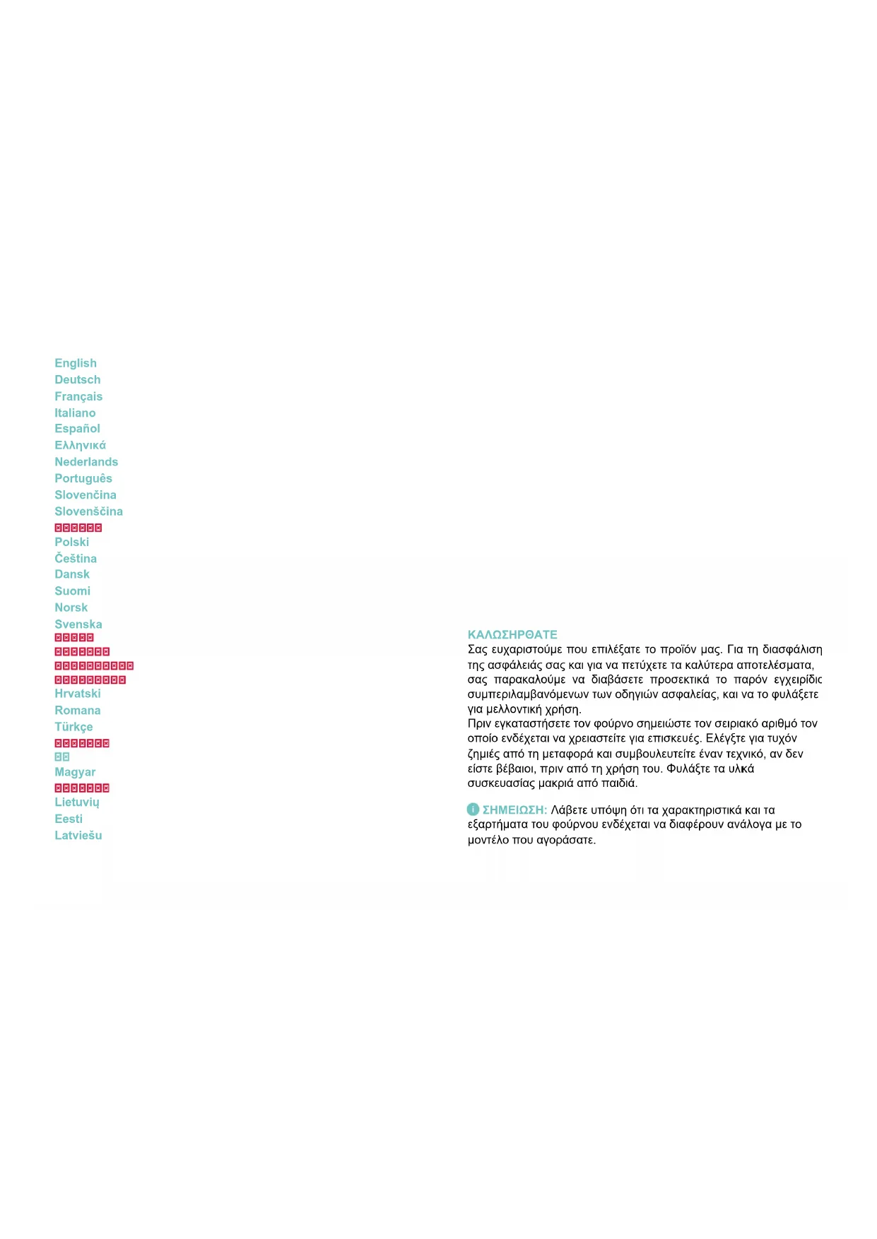 ΣΗΜΕΙΩΣΗ: Λάβετε υπόψη ότι τα χαρακτηριστικά και τα εξαρτήματα του φούρνου ενδέχεται να διαφέρουν ανάλογα με το μοντέλο που αγοράσατε.ΣΥΝΟΨΗ