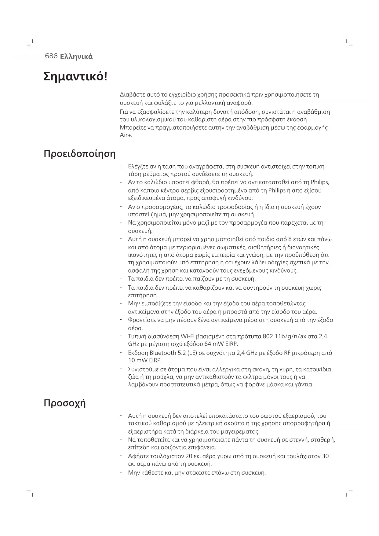 Διαβάστε αυτό το εγχειρίδιο χρήσης προσεκτικά πριν χρησιμοποιήσετε τη συσκευή και φυλάξτε το για μελλοντική αναφορά. Για να εξασφαλίσετε την καλύτερη δυνατή απόδοση, συνιστάται η αναβάθμιση του υλικολογισμικού του καθαριστή αέρα στην πιο πρόσφατη έκδοση. Μπορείτε να πραγματοποιήσετε αυτήν την αναβάθμιση μέσω της εφαρμογής Air+. Προειδοποίηση