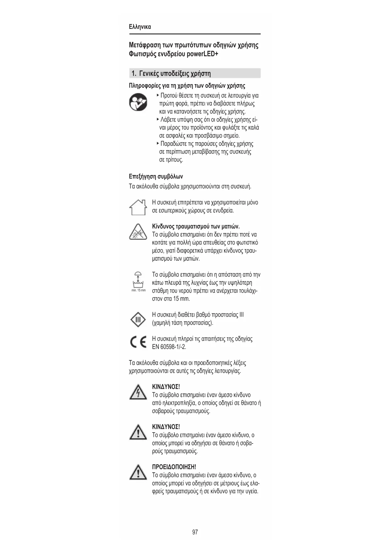 Πληροφορίες για τη χρήση των οδηγιών χρήσης ▶ Προτού θέσετε τη συσκευή σε λειτουργία για πρώτη φορά, πρέπει να διαβάσετε πλήρως και να κατανοήσετε τις οδηγίες χρήσης. ▶ Λάβετε υπόψη σας ότι οι οδηγίες χρήσης εί- ναι μέρος του προϊόντος και φυλάξτε τις καλά σε ασφαλές και προσβάσιμο σημείο. ▶ Παραδώστε τις παρούσες οδηγίες χρήσης σε περίπτωση μεταβίβασης της συσκευής σε τρίτους. Επεξήγηση συμβόλων Τα ακόλουθα σύμβολα χρησιμοποιούνται στη συσκευή. Η συσκευή επιτρέπεται να χρησιμοποιείται μόνο σε εσωτερικούς χώρους σε ενυδρεία. Κίνδυνος τραυματισμού των ματιών. Το σύμβολο επισημαίνει ότι δεν πρέπει ποτέ να κοιτάτε για πολλή ώρα απευθείας στο φωτιστικό μέσο, γιατί διαφορετικά υπάρχει κίνδυνος τραυ- ματισμού των ματιών. Το σύμβολο επισημαίνει ότι η απόσταση από την κάτω πλευρά της λυχνίας έως την υψηλότερη στάθμη του νερού πρέπει να ανέρχεται τουλάχι- στον στα 15 mm. Η συσκευή διαθέτει βαθμό προστασίας III (χαμηλή τάση προστασίας). Η συσκευή πληροί τις απαιτήσεις της οδηγίας EN 60598-1/-2. Τα ακόλουθα σύμβολα και οι προειδοποιητικές λέξεις χρησιμοποιούνται σε αυτές τις οδηγίες λειτουργίας.