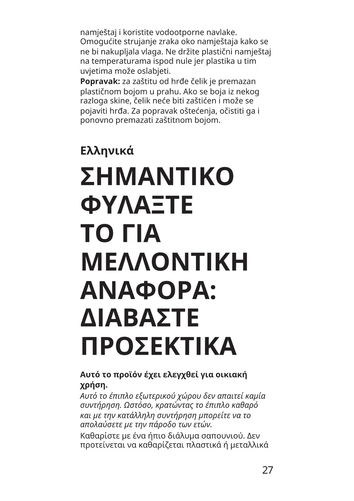 Αυτό το έπιπλο εξωτερικού χώρου δεν απαιτεί καμία συντήρηση. Ωστόσο, κρατώντας το έπιπλο καθαρό και με την κατάλληλη συντήρηση μπορείτε να το απολαύσετε με την πάροδο των ετών. Καθαρίστε με ένα ήπιο διάλυμα σαπουνιού. Δεν προτείνεται να καθαρίζεται πλαστικά ή μεταλλικά28 έπιπλα με ισχυρό καθαριστικό ή λειαντικό υλικό επειδή μπορεί να αποχρωματίσει ή να να φθείρει την επιφάνεια. Συντήρηση: Δεν απαιτείται συντήρηση. Αποθήκευση: Αν είναι δυνατόν, αποθηκεύστε τα πλαστικά έπιπλα εξωτερικού χώρου σε ένα στεγνό και δροσερό μέρος σε κλειστούς χώρους. Όταν αποθηκεύονται έξω, γείρετε τα έπιπλα και χρησιμοποιήστε κατά προτίμηση υδατοαπωθητικά καλύμματα. Βεβαιωθείτε ότι ο αέρας μπορεί να κυκλοφορεί για την αποφυγή υγρασίας. Σε χαμηλές θερμοκρασίας, το πλαστικό μπορεί να αποδυναμώσει και δεν συνιστάται για χρήση. Επιδιόρθωση: Το ατσάλι προστατεύεται από τη σκουριά με μια κονιορτοποιημένη επιφάνεια πλαστικής βαφής. Εάν, για οποιοδήποτε λόγο, το ατσάλι παραμείνει απροστάτευτο, μπορεί να σκουριάσει. Για να επιδιορθώσετε τη ζημιά, καθαρίστε και βάψτε ξανά την επιφάνεια.