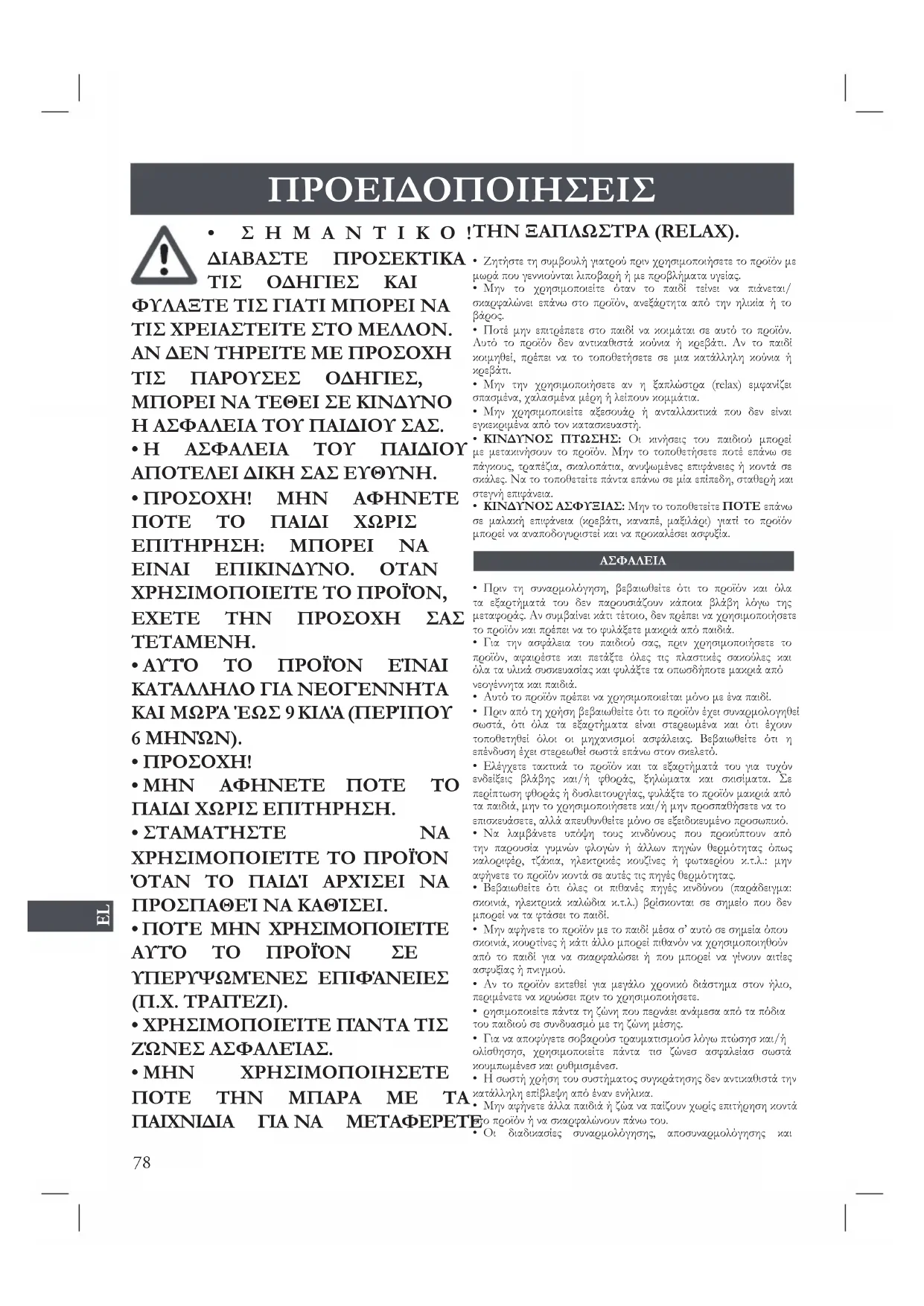 - ΠΡΟΣΟΧΗ! ΜΗΝ ΑΦΗΝΕΤΕ ΠΟΤΕ ΤΟ ΠΑΙΔΙ ΧΩΡΙΣ ΕΠΙΤΗΡΗΣΗ: ΜΠΟΡΕΙ ΝΑ ΕΙΝΑΙ ΕΠΙΚΙΝΔΥΝΟ. ΟΤΑΝ ΧΡΗΣΙΜΟΠΟΙΕΙΤΕΤΟΠΡΟΪΌΝ, ΕΧΕΤΕ ΤΗΝ ΠΡΟΣΟΧΗ ΣΑΣ