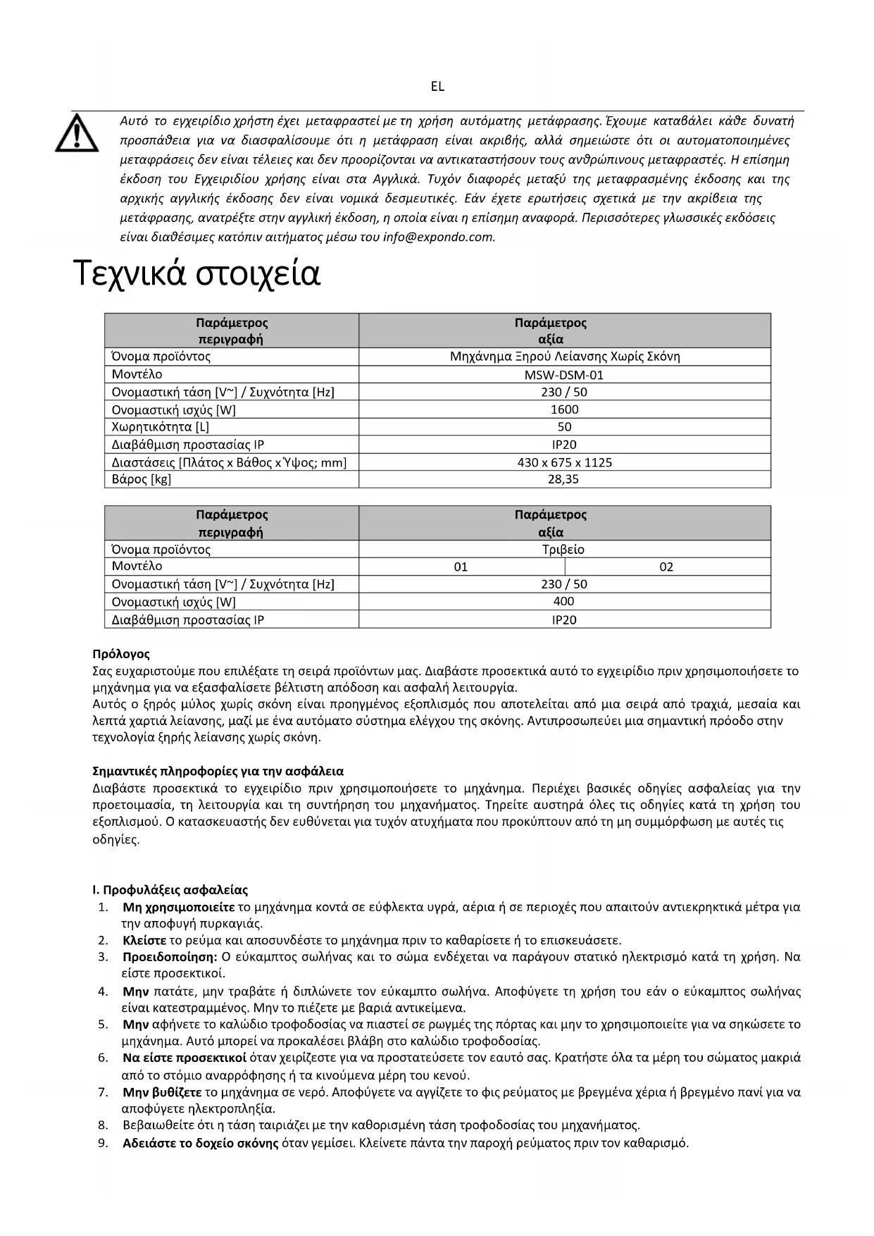 Σας ευχαριστούμε που επιλέξατε τη σειρά προϊόντων μας. Διαβάστε προσεκτικά αυτό το εγχειρίδιο πριν χρησιμοποιήσετε το μηχάνημα για να εξασφαλίσετε βέλτιστη απόδοση και ασφαλή λειτουργία. Αυτός ο ξηρός μύλος χωρίς σκόνη είναι προηγμένος εξοπλισμός που αποτελείται από μια σειρά από τραχιά, μεσαία και λεπτά χαρτιά λείανσης, μαζί με ένα αυτόματο σύστημα ελέγχου της σκόνης. Αντιπροσωπεύει μια σημαντική πρόοδο στην τεχνολογία ξηρής λείανσης χωρίς σκόνη. Σημαντικές πληροφορίες για την ασφάλεια Διαβάστε προσεκτικά το εγχειρίδιο πριν χρησιμοποιήσετε το μηχάνημα. Περιέχει βασικές οδηγίες ασφαλείας για την προετοιμασία, τη λειτουργία και τη συντήρηση του μηχανήματος. Τηρείτε αυστηρά όλες τις οδηγίες κατά τη χρήση του εξοπλισμού. Ο κατασκευαστής δεν ευθύνεται για τυχόν ατυχήματα που προκύπτουν από τη μη συμμόρφωση με αυτές τις