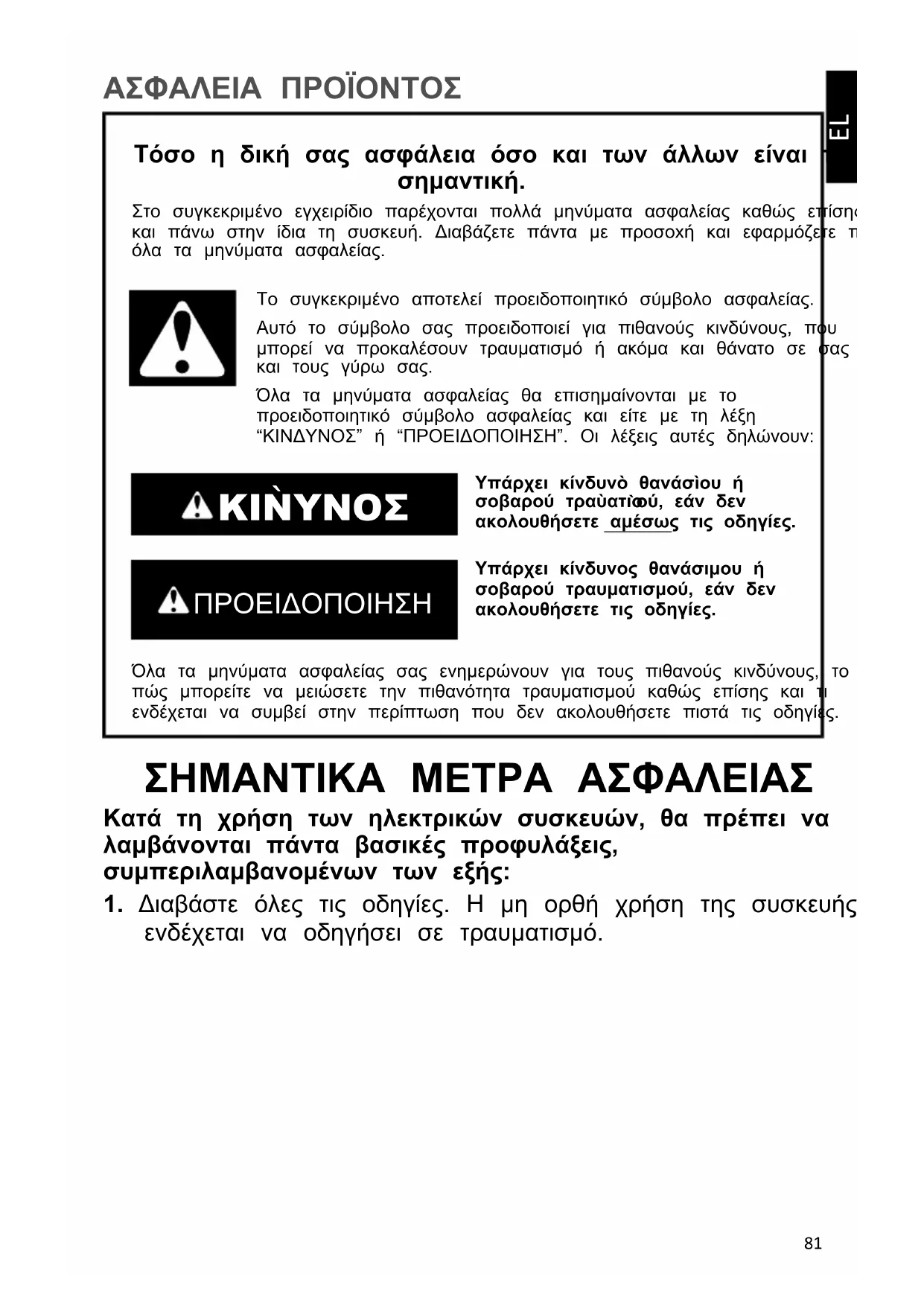Υπάρχει κίνδυνὸ θανάσὶου ήσοβαρού τραὺατισ ού, εάν δενακολουθήσετε αμέσως τις οδηγίες. ΠΡΟΕΙΔΟΠΟΙΗΣΗ Υπάρχει κίνδυνος θανάσιμου ήσοβαρού τραυματισμού, εάν δενακολουθήσετε τις οδηγίες.Όλα τα μηνύματα ασφαλείας σας ενημερώνουν για τους πιθανούς κινδύνους, τοπώς μπορείτε να μειώσετε την πιθανότητα τραυματισμού καθώς επίσης και τιενδέχεται να συμβεί στην περίπτωση που δεν ακολουθήσετε πιστά τις οδηγίες. ΣΗΜΑΝΤΙΚΑ ΜΕΤΡΑ ΑΣΦΑΛΕΙΑΣ Κατά τη χρήση των ηλεκτρικών συσκευών, θα πρέπει να λαμβάνονται πάντα βασικές προφυλάξεις, συμπεριλαμβανομένων των εξής: