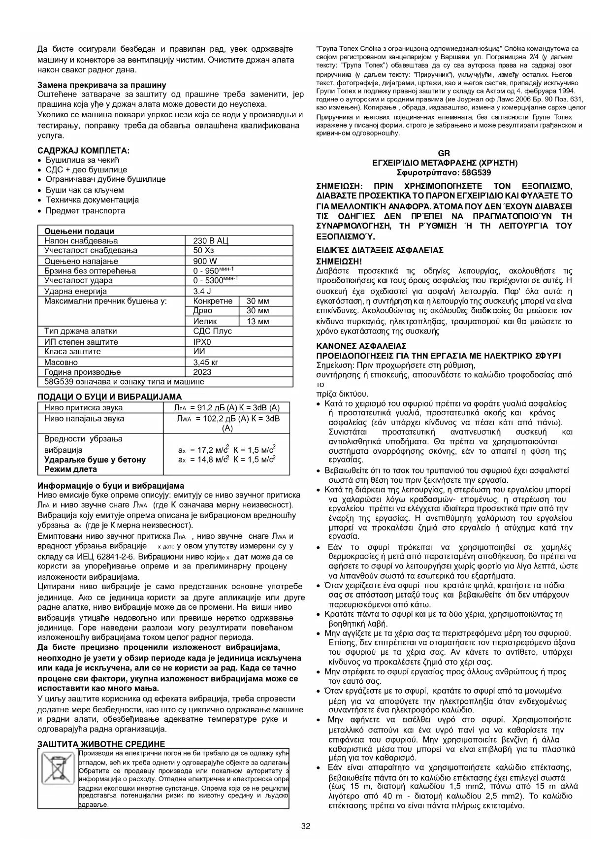 Δήλωση συμμόρφωσης ΕΚ Κατασκευαστής: Sp.k., Pograniczna 2/4 02-285 Warszawa Προϊόν: SDS+ σφυροτρύπανο Μοντέλο: 58G539 Εμπορική ονομασία: GRAPHITE Σειριακός αριθμός: 00001 ÷ 99999 Η παρούσα δήλωση συμμόρφωσης εκδίδεται με αποκλειστική ευθύνη του κατασκευαστή. Το προϊόν που περιγράφεται παραπάνω συμμορφώνεται με τα ακόλουθα