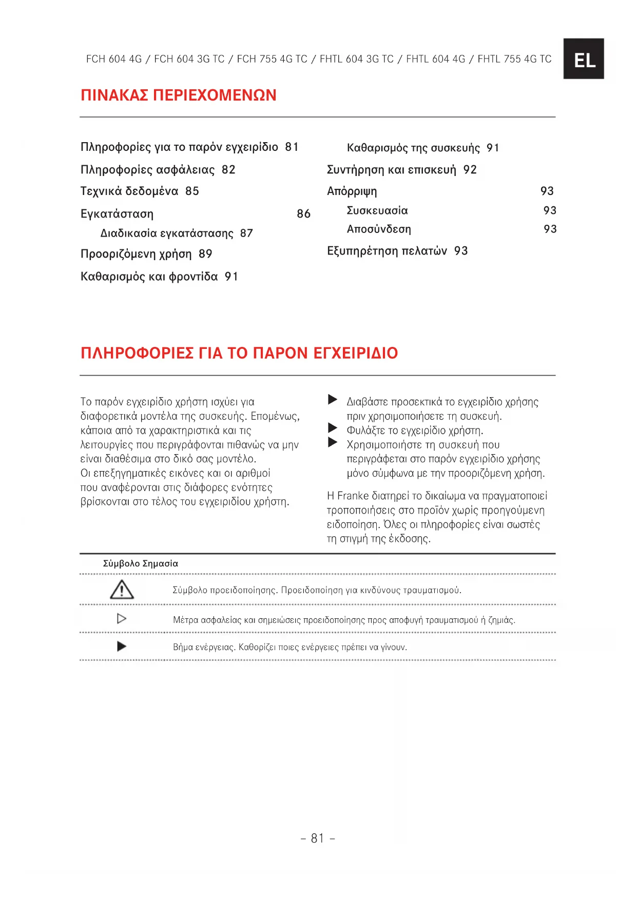 Χρησιμοποιήστε τη συσκευή που περιγράφεται στο παρόν εγχειρίδιο χρήσης μόνο σύμφωνα με την προοριζόμενη χρήση. Η Franke διατηρεί το δικαίωμα να πραγματοποιεί τροποποιήσεις στο προϊόν χωρίς προηγούμενη ειδοποίηση. Όλες οι πληροφορίες είναι σωστές τη στιγμή της έκδοσης. ΠΊΝΑΚΑΣ ΠΕΡΊΕΧΟΜΕΝΩΝ Πληροφορίες για το παρόν εγχειρίδιο 81 Πληροφορίες ασφάλειας 82 Τεχνικά δεδομένα 85 Εγκατάσταση 86 Διαδικασία εγκατάστασης 87 Προοριζόμενη χρήση 89 Καθαρισμός και φροντίδα 91 Καθαρισμός της συσκευής 91 Συντήρηση και επισκευή 92 Απόρριψη 93 Συσκευασία 93 Αποσύνδεση 93 Εξυπηρέτηση πελατών 93– 82 – FCH 604 4G / FCH 604 3G TC / FCH 755 4G TC / FHTL 604 3G TC / FHTL 604 4G / FHTL 755 4G TC