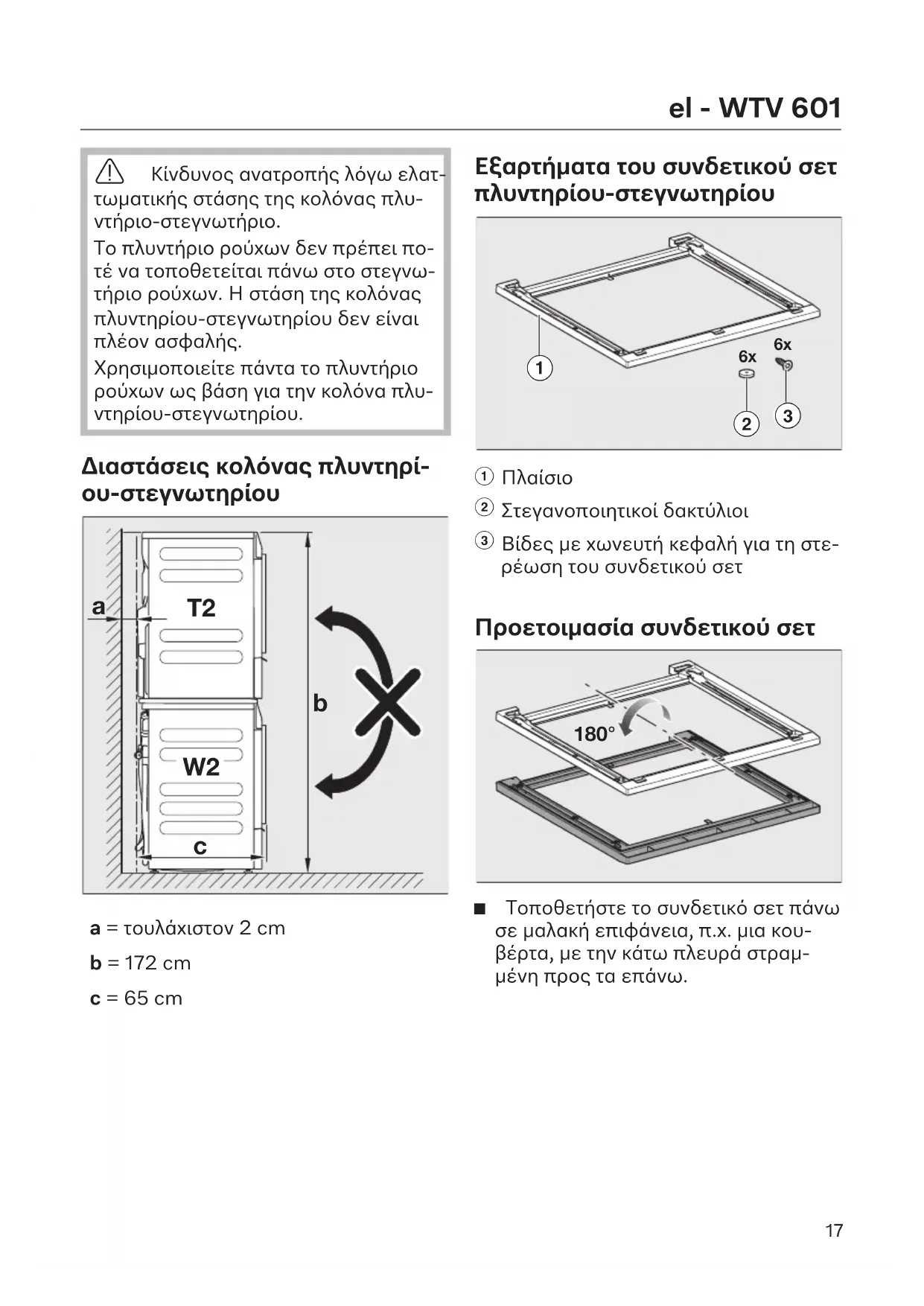 a = τουλάχιστον 2cm b = 172cm c = 65cm Εξαρτήματα του συνδετικού σετ πλυντηρίου-στεγνωτηρίου