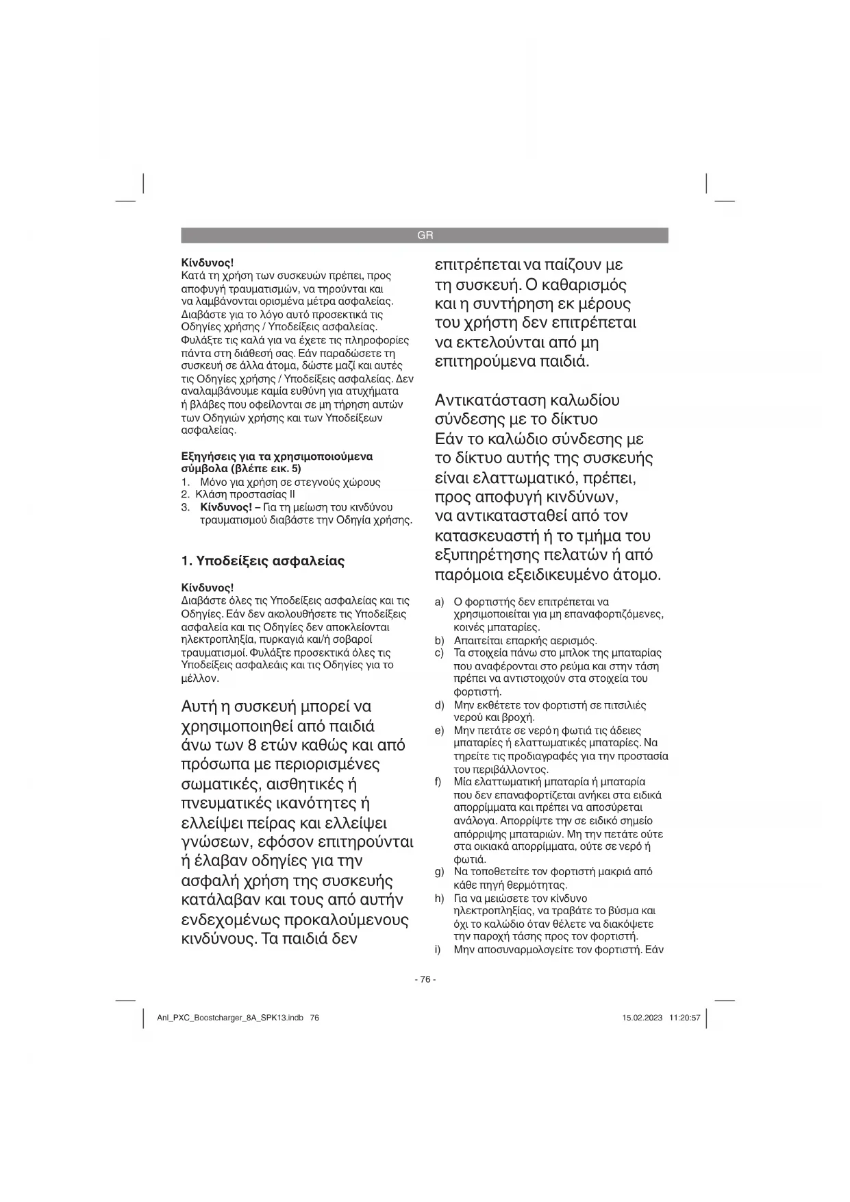 Ο ιδιοκτήτης της ηλεκτρικής συσκευής υποχρεούται αντί της επιστροφής να συμβάλει στη σωστή ανακύκλωση σε περίπτωση που δεν συνεχίζει να χρησιμοποιεί τη συσκευή. Η παλιά συσκευή μπορεί να παραχωρηθεί σε κέντρο επιστροφής ηλεκτρικών συσκευών με την έννοια των εθνικών νόμων ανακύκλωσης και διαχείρισης αποβλήτων. Δεν συμπεριλαμβάνονται τα τμήματα παλιών συσκευών και τα βοηθητικά στοιχεία χωρίς ηλεκτρικά εξαρτήματα. Παρακαλούμε κατά την διάθεση στα απορρίμματα να προσέξετε να αφαιρεθούν οι μπαταρίες και ταείδη φωτισμού από τη συσκευή (π.χ. λάμπες). Η ανατύπωση ή οποιασδήποτε άλλης μορφής αναπαραγωγή της τεκμηρίωσης ή άλλων δικαιολογητικών που αναφέρονται στα προϊόντα, ακόμη και αποσπασματικά, επιτρέπεται μόνο με ρητή συγκατάθεση της Ein- hell Germany AG. M ε επιφύλαξη τεχνικών τροποποιήσεων Anl_PXC_Boostcharger_8A_SPK13.indb 78Anl_PXC_Boostcharger_8A_SPK13.indb 78 15.02.2023 11:20:5715.02.2023 11:20:57GR