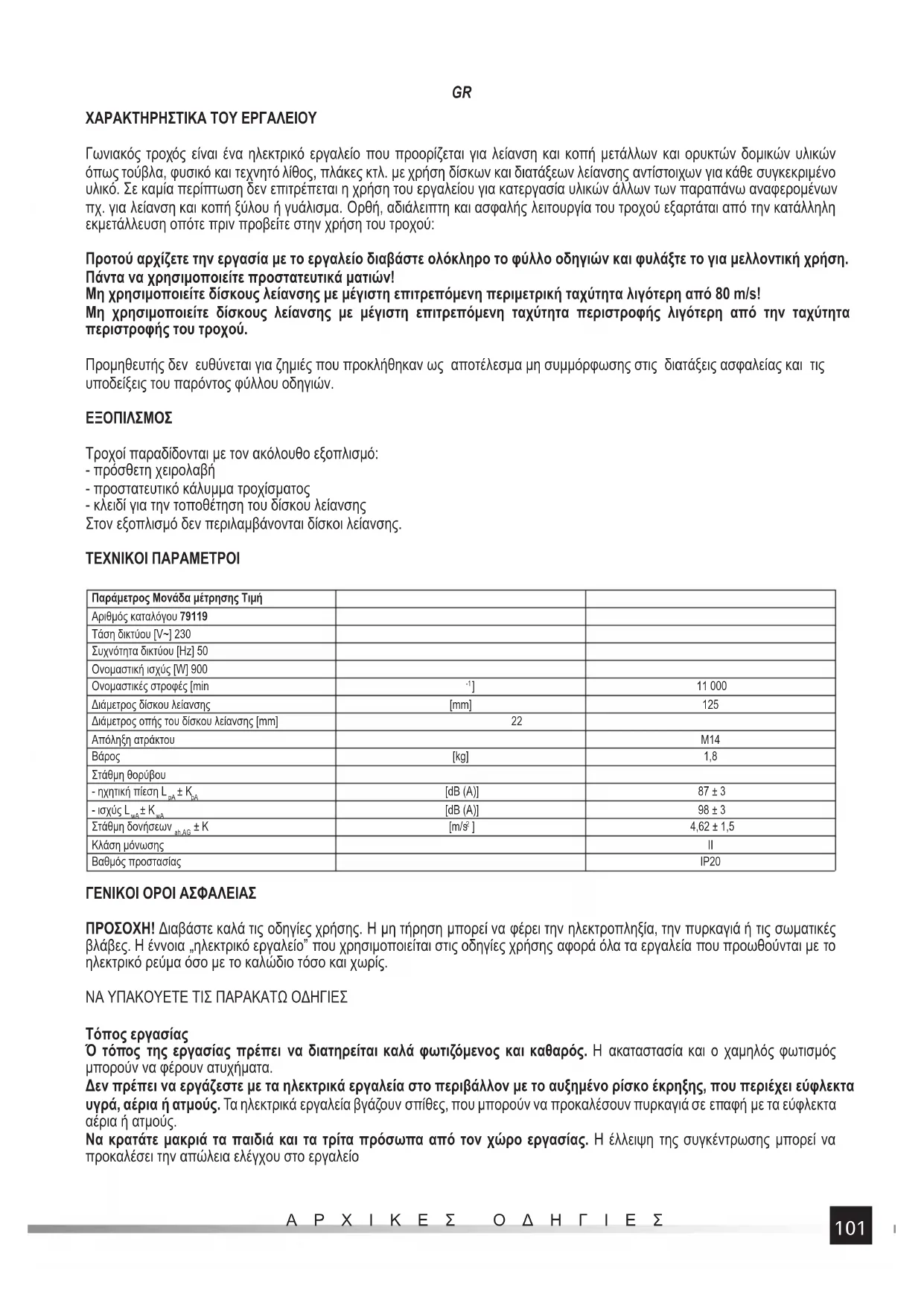 ΑΡΧΙΚΕΣ ΟΔΗΓΙΕΣ ΧΑΡΑΚΤΗΡΗΣΤΙΚΑ ΤΟΥ ΕΡΓΑΛΕΙΟΥ Γωνιακός τροχός είναι ένα ηλεκτρικό εργαλείο που προορίζεται για λείανση και κοπή μετάλλων και ορυκτών δομικών υλικών όπως τούβλα, φυσικό και τεχνητό λίθος, πλάκες κτλ. με χρήση δίσκων και διατάξεων λείανσης αντίστοιχων για κάθε συγκεκριμένο υλικό. Σε καμία περίπτωση δεν επιτρέπεται η χρήση του εργαλείου για κατεργασία υλικών άλλων των παραπάνω αναφερομένων πχ. για λείανση και κοπή ξύλου ή γυάλισμα. Ορθή, αδιάλειπτη και ασφαλής λειτουργία του τροχού εξαρτάται από την κατάλληλη εκμετάλλευση οπότε πριν προβείτε στην χρήση του τροχού: Προτού αρχίζετε την εργασία με το εργαλείο διαβάστε ολόκληρο το φύλλο οδηγιών και φυλάξτε το για μελλοντική χρήση. Πάντα να χρησιμοποιείτε προστατευτικά ματιών! Μη χρησιμοποιείτε δίσκους λείανσης με μέγιστη επιτρεπόμενη περιμετρική ταχύτητα λιγότερη από 80 m/s! Μη χρησιμοποιείτε δίσκους λείανσης με μέγιστη επιτρεπόμενη ταχύτητα περιστροφής λιγότερη από την ταχύτητα περιστροφής του τροχού. Προμηθευτής δεν ευθύνεται για ζημιές που προκλήθηκαν ως αποτέλεσμα μη συμμόρφωσης στις διατάξεις ασφαλείας και τις υποδείξεις του παρόντος φύλλου οδηγιών.
