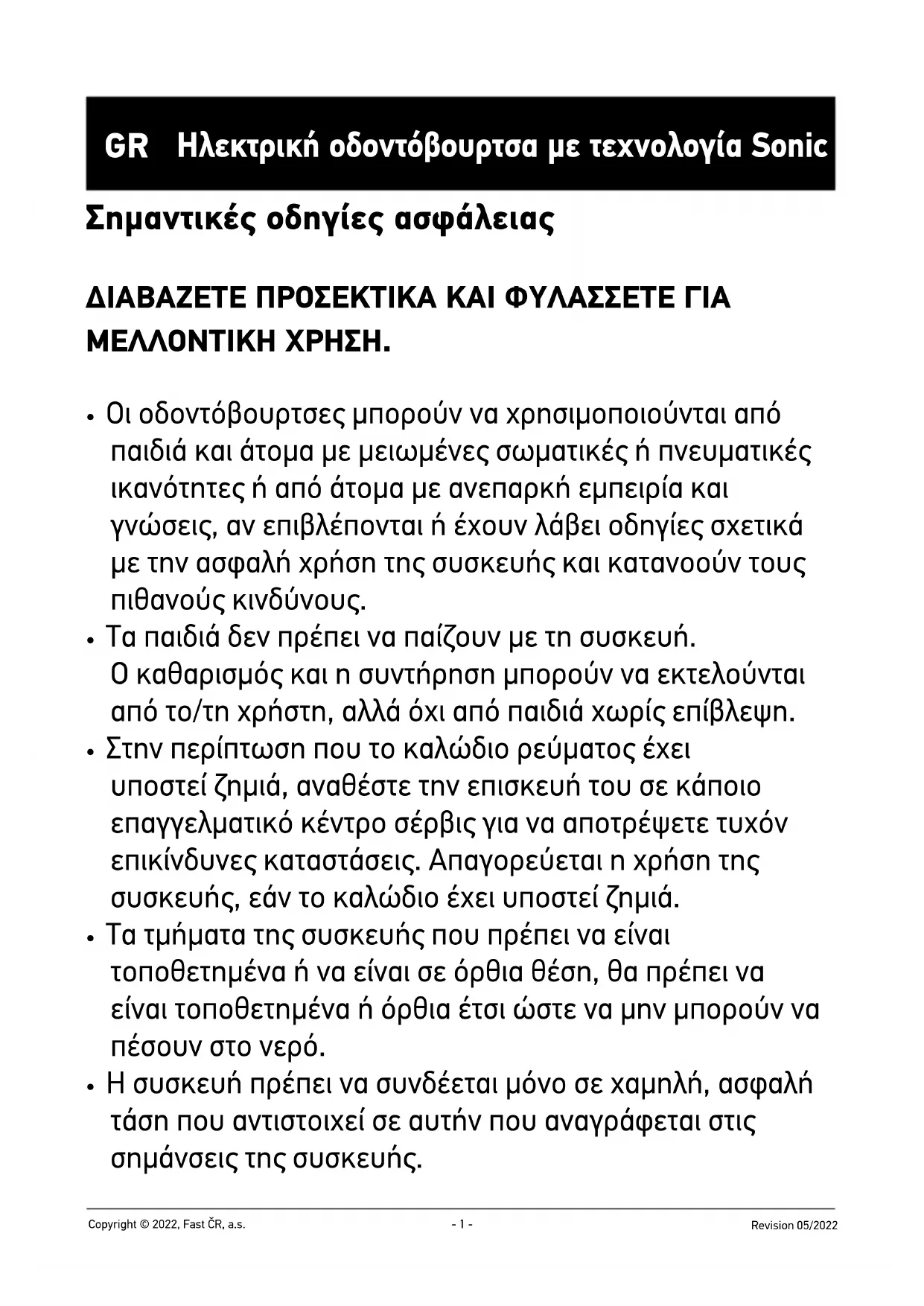 - Σε περίπτωση που η οδοντόβουρτσα, η βάση φόρτισης, το καλώδιο της βάσης φόρτισης, ο φορτιστής ταξιδιού, η λάμπα UV ή το καλώδιο USB εμφανίζουν οποιαδήποτε σημάδια βλάβης, μην τα χρησιμοποιήσετε. Πάντα να αντικαθιστάτε το φθαρμένο φορτιστή ταξιδίου ή το καλώδιο USB με αυθεντικά ανταλλακτικά. Το καλώδιο ρεύματος στη βάση φόρτισης δεν μπορεί να αντικατασταθεί. Σε περίπτωση που υποστεί βλάβη, η βάση φόρτισης πρέπει να πεταχτεί και να αντικατασταθεί με μια νέα. Για την αντικατάσταση φθαρμένων αξεσουάρ και για κάθε είδους επισκευή της οδοντόβουρτσας, επικοινωνήστε με ένα εξουσιοδοτημένο κέντρο σέρβις. Μην επισκευάζετε μόνοι σας την οδοντόβουρτσα. Επεμβαίνοντας οι ίδιοι στο προϊόν διατρέχετε τον κίνδυνο να ακυρώσετε τα δικαιώματά σας στο πλαίσιο της εγγύησης για ανεπαρκή απόδοση ή κακή ποιότητα.- 3 - Revision 05/2022 Copyright © 2022, Fast ČR, a.s.