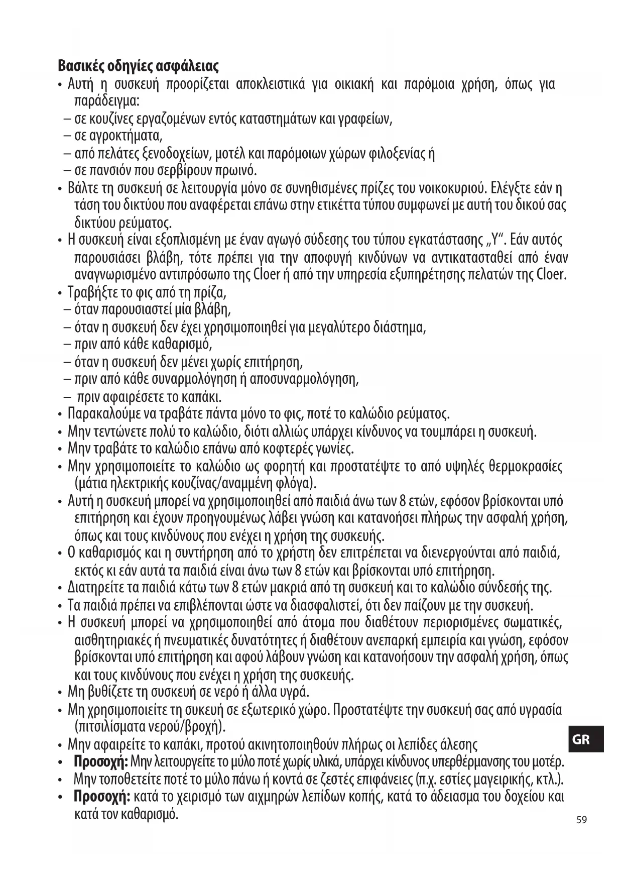 - Η συσκευή είναι εξοπλισμένη με έναν αγωγό σύδεσης του τύπου εγκατάστασης „Y“. Εάν αυτός παρουσιάσει βλάβη, τότε πρέπει για την αποφυγή κινδύνων να αντικατασταθεί από έναν αναγνωρισμένο αντιπρόσωπο της Cloer ή από την υπηρεσία εξυπηρέτησης πελατών της Cloer.