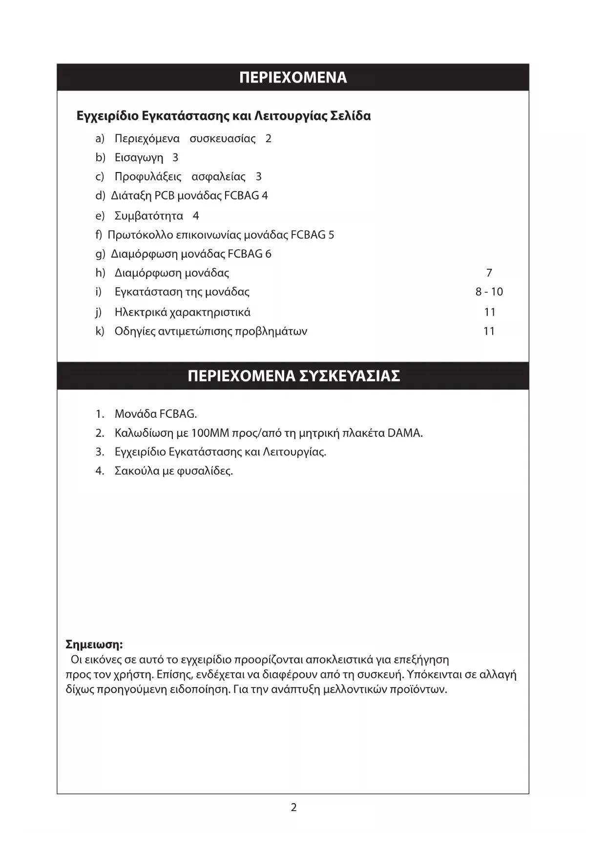 Οι εικόνες σε αυτό το εγχειρίδιο προορίζονται αποκλειστικά για επεξήγηση προς τον χρήστη. Επίσης, ενδέχεται να διαφέρουν από τη συσκευή. Υπόκεινται σε αλλαγή δίχως προηγούμενη ειδοποίηση. Για την ανάπτυξη μελλοντικών προϊόντων. ΠΕΡΙΕΧΟΜΕΝΑ Εγχειρίδιο Εγκατάστασης και Λειτουργίας Σελίδα a) Περιεχόμενα συσκευασίας 2 b) Εισαγωγη 3 c) Προφυλάξεις ασφαλείας 3 d) Διάταξη PCB μονάδας FCBAG 4 e) Συμβατότητα 4 f) Πρωτόκολλο επικοινωνίας μονάδας FCBAG 5 g) Διαμόρφωση μονάδας FCBAG 6 h) Διαμόρφωση μονάδας 7