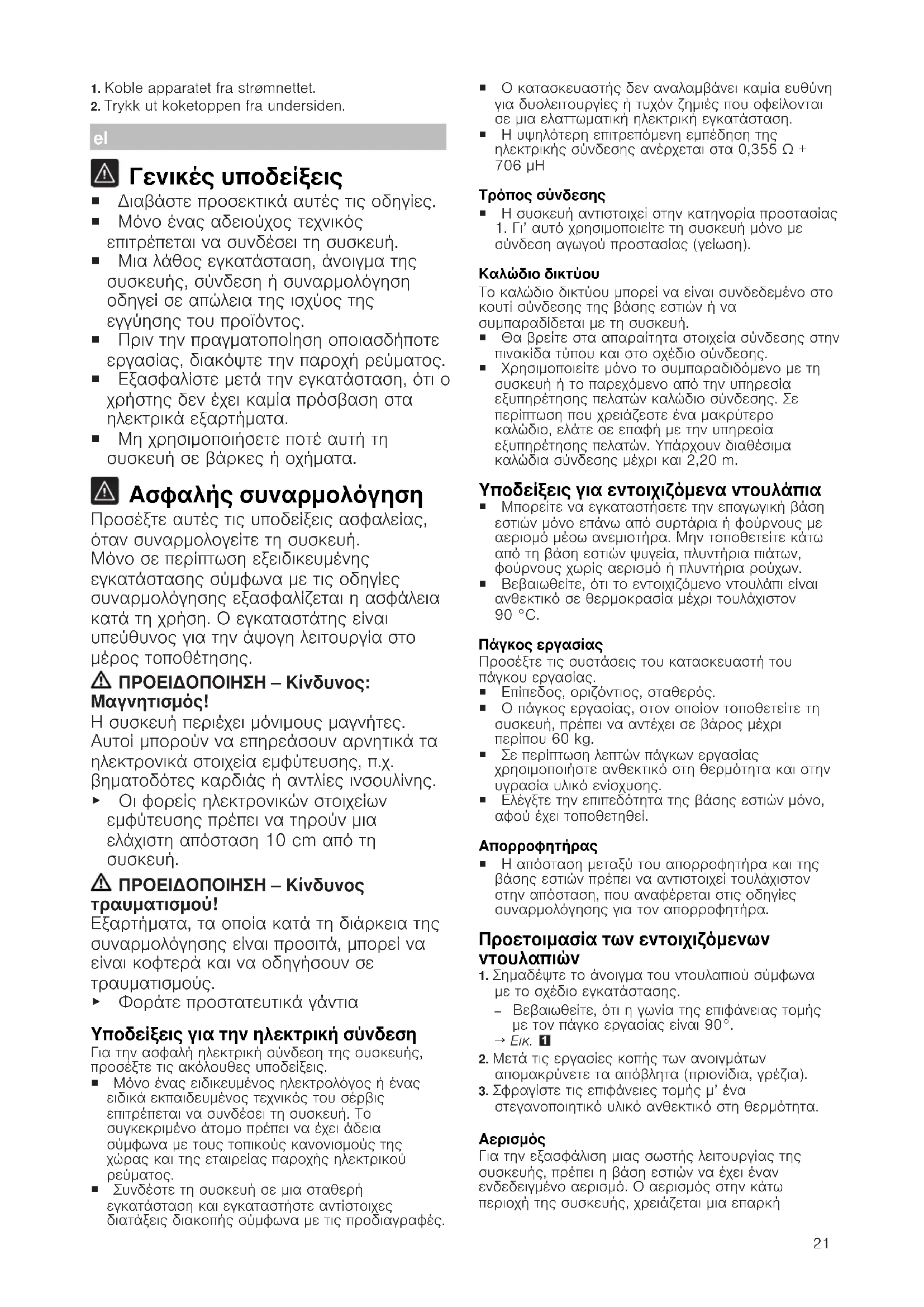 Γενικές υποδείξεις ¡ Διαβάστε προσεκτικά αυτές τις οδηγίες. ¡ Μόνο ένας αδειούχος τεχνικός επιτρέπεται να συνδέσει τη συσκευή. ¡ Μια λάθος εγκατάσταση, άνοιγμα της συσκευής, σύνδεση ή συναρμολόγηση οδηγεί σε απώλεια της ισχύος της εγγύησης του προϊόντος. ¡ Πριν την πραγματοποίηση οποιασδήποτε εργασίας, διακόψτε την παροχή ρεύματος. ¡ Εξασφαλίστε μετά την εγκατάσταση, ότι ο χρήστης δεν έχει καμία πρόσβαση στα ηλεκτρικά εξαρτήματα. ¡ Μη χρησιμοποιήσετε ποτέ αυτή τη συσκευή σε βάρκες ή οχήματα. Ασφαλής συναρμολόγηση Προσέξτε αυτές τις υποδείξεις ασφαλείας, όταν συναρμολογείτε τη συσκευή. Μόνο σε περίπτωση εξειδικευμένης εγκατάστασης σύμφωνα με τις οδηγίες συναρμολόγησης εξασφαλίζεται η ασφάλεια κατά τη χρήση. Ο εγκαταστάτης είναι υπεύθυνος για την άψογη λειτουργία στο μέρος τοποθέτησης. ΠΡΟΕΙΔΟΠΟΙΗΣΗ‒Κίνδυνος: Μαγνητισμός! Η συσκευή περιέχει μόνιμους μαγνήτες. Αυτοί μπορούν να επηρεάσουν αρνητικά τα ηλεκτρονικά στοιχεία εμφύτευσης, π.χ. βηματοδότες καρδιάς ή αντλίες ινσουλίνης. ▶ Οι φορείς ηλεκτρονικών στοιχείων εμφύτευσης πρέπει να τηρούν μια ελάχιστη απόσταση 10 cm από τη
