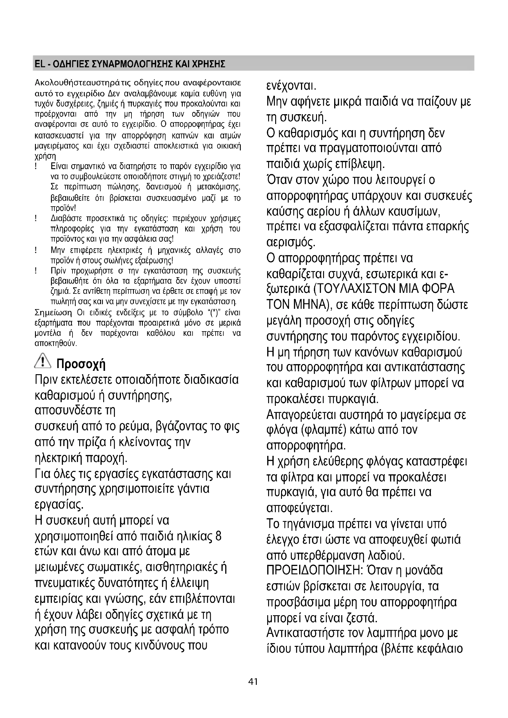 Μην αφήνετε μικρά παιδιά να παίζουν με τη συσκευή. Ο καθαρισμός και η συντήρηση δεν πρέπει να πραγματοποιούνται από παιδιά χωρίς επίβλεψη. Όταν στον χώρο που λειτουργεί ο απορροφητήρας υπάρχουν και συσκευές καύσης αερίου ή άλλων καυσίμων, πρέπει να εξασφαλίζεται πάντα επαρκής