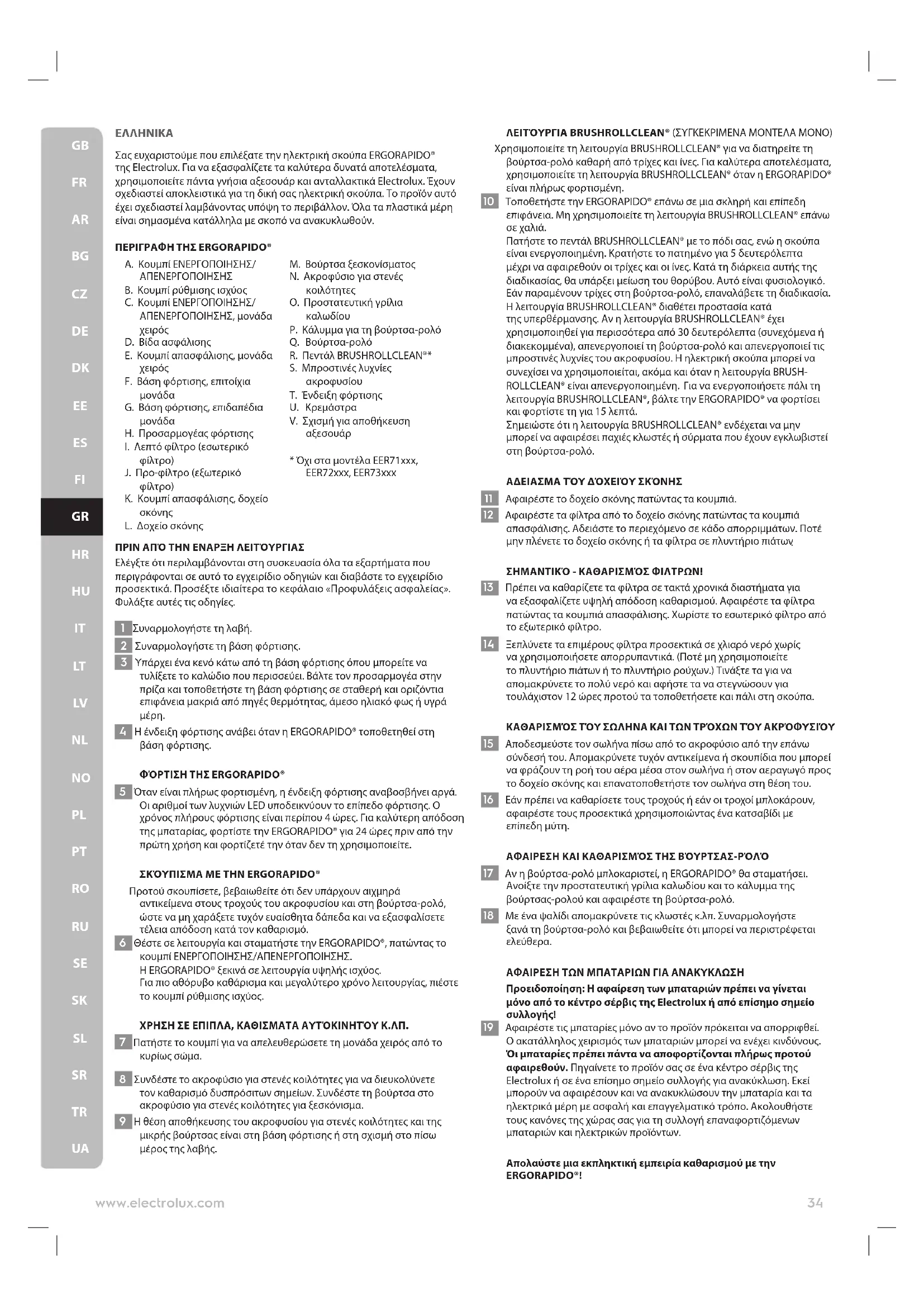 19 Αφαιρέστε τις µπαταρίες µόνο αν το προϊόν πρόκειται να απορριφθεί. Ο ακατάλληλος χειρισµός των µπαταριών µπορεί να ενέχει κινδύνους. Όι µπαταρίες πρέπει πάντα να αποφορτίζονται πλήρως προτού αφαιρεθούν. Πηγαίνετε το προϊόν σας σε ένα κέντρο σέρβις της Electrolux ή σε ένα επίσηµο σηµείο συλλογής για ανακύκλωση. Εκεί µπορούν να αφαιρέσουν και να ανακυκλώσουν την µπαταρία και τα ηλεκτρικά µέρη µε ασφαλή και επαγγελµατικό τρόπο. Ακολουθήστε τους κανόνες της χώρας σας για τη συλλογή επαναφορτιζόµενων µπαταριών και ηλεκτρικών προϊόντων. Απολαύστε µια εκπληκτική εµπειρία καθαρισµού µε την ERGORAPIDO®! 34www.electrolux.com