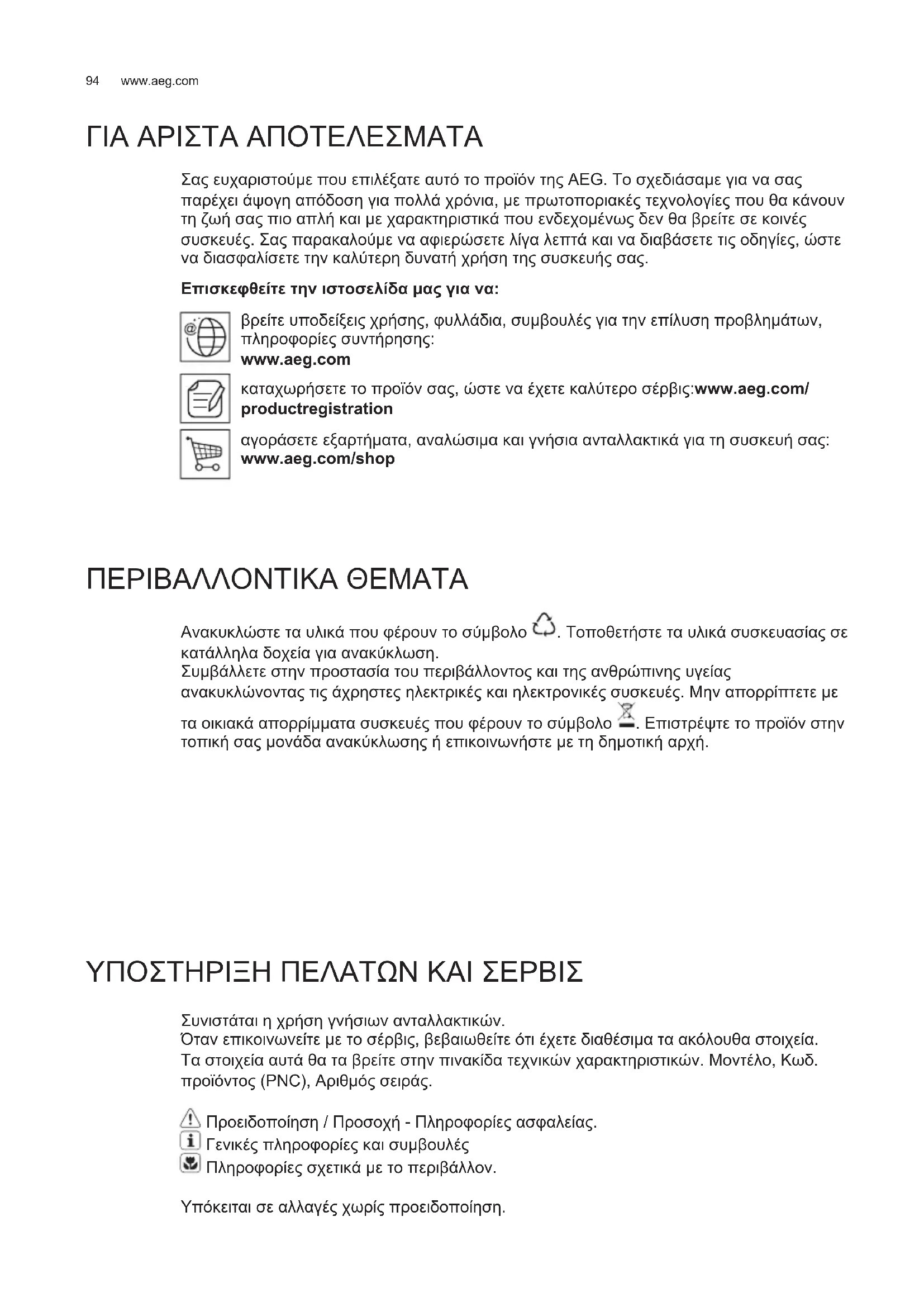 ΓΙΑ ΑΡΙΣΤΑ ΑΠΟΤΕΛΕΣΜΑΤΑ Σας ευχαριστούμε που επιλέξατε αυτό το προϊόν της AEG. Το σχεδιάσαμε για να σας παρέχει άψογη απόδοση για πολλά χρόνια, με πρωτοποριακές τεχνολογίες που θα κάνουν τη ζωή σας πιο απλή και με χαρακτηριστικά που ενδεχομένως δεν θα βρείτε σε κοινές συσκευές. Σας παρακαλούμε να αφιερώσετε λίγα λεπτά και να διαβάσετε τις οδηγίες, ώστε να διασφαλίσετε την καλύτερη δυνατή χρήση της συσκευής σας. Επισκεφθείτε την ιστοσελίδα μας για να: βρείτε υποδείξεις χρήσης, φυλλάδια, συμβουλές για την επίλυση προβλημάτων, πληροφορίες συντήρησης: www.aeg.com καταχωρήσετε το προϊόν σας, ώστε να έχετε καλύτερο σέρβις:www.aeg.com/ productregistration αγοράσετε εξαρτήματα, αναλώσιμα και γνήσια ανταλλακτικά για τη συσκευή σας: www.aeg.com/shop ΠΕΡΙΒΑΛΛΟΝΤΙΚΑ ΘΕΜΑΤΑ Ανακυκλώστε τα υλικά που φέρουν το σύμβολο . Τοποθετήστε τα υλικά συσκευασίας σε κατάλληλα δοχεία για ανακύκλωση. Συμβάλλετε στην προστασία του περιβάλλοντος και της ανθρώπινης υγείας ανακυκλώνοντας τις άχρηστες ηλεκτρικές και ηλεκτρονικές συσκευές. Μην απορρίπτετε με τα οικιακά απορρίμματα συσκευές που φέρουν το σύμβολο . Επιστρέψτε το προϊόν στην τοπική σας μονάδα ανακύκλωσης ή επικοινωνήστε με τη δημοτική αρχή. ΥΠΟΣΤΗΡΙΞΗ ΠΕΛΑΤΩΝ ΚΑΙ ΣΕΡΒΙΣ Συνιστάται η χρήση γνήσιων ανταλλακτικών. Όταν επικοινωνείτε με το σέρβις, βεβαιωθείτε ότι έχετε διαθέσιμα τα ακόλουθα στοιχεία. Τα στοιχεία αυτά θα τα βρείτε στην πινακίδα τεχνικών χαρακτηριστικών. Μοντέλο, Κωδ. προϊόντος (PNC), Αριθμός σειράς. Προειδοποίηση / Προσοχή - Πληροφορίες ασφαλείας. Γενικές πληροφορίες και συμβουλές Πληροφορίες σχετικά με το περιβάλλον. Υπόκειται σε αλλαγές χωρίς προειδοποίηση. EL ΟΔΗΓΊΕΣ ΧΡΉΣΗΣ95